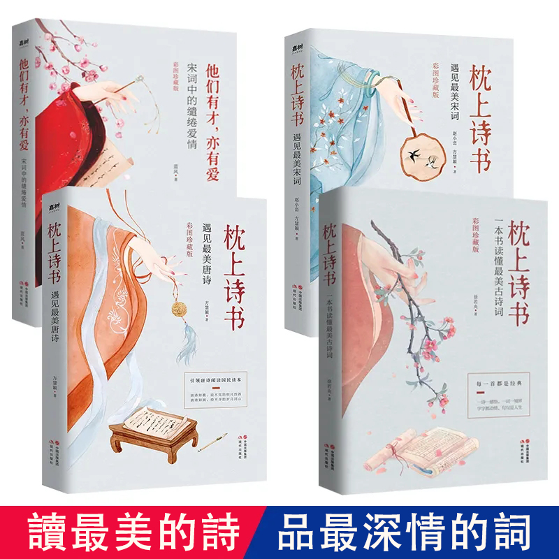 【枕上詩書四冊彩圖珍藏版】每一首詩都是一段傳奇,每首詞都有它的故事,這套書,內含五百首詩詞的講解,彩圖繪製,圖文並茂,讀一讀,解憂貫通,意滿時讀一讀,居危思安! (贈唯美古風仕女明信片)【貨到付款 免郵資】