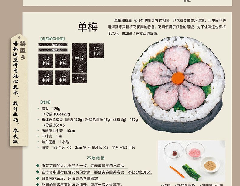 《造型壽司》旨在教您如何製作出擁有多種圖案與花樣的造型壽司,並利用它們來擺盤,成為適合在逢年過節或活動場合時驚艷全場的創意裝飾壽司!日本的壽司講究嚴謹的前置作業與調理方式,川澄師傅正是重視這點並列為優先考量來製作裝飾壽司的。為此,前置作業和製作過程就馬虎不得。必須計算顧客享用的時間、選用新鮮度不易降低的食材、不讓醋飯冷掉,還要在最後步驟才放上生鮮的配料等。能夠確實掌握這些細節的話,就能做出視覺和味覺上同時令人驚豔的壽司藝術品了。讓我們從頭開始學習最基礎的壽司基本功,例如:如何製作醋飯、壽司的切法、握法等,再進階到裝飾擺盤的技巧與方法,請務必參考本書來製作裝飾壽司,相信成果會更令人滿意!