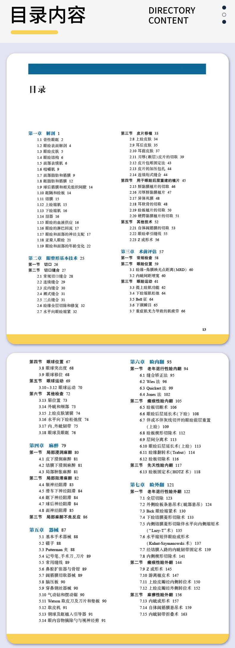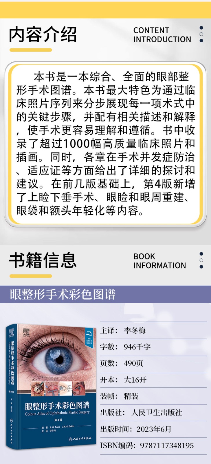 本書是一本綜合、全面的眼部整形手術圖。本書最大特色為透過臨床照片序列來逐步展現每一項術式中的關鍵步驟,並配有相關描述和解釋,使手術更容易理解和遵循。書中收錄了超過1000幅高品質臨床照片和插畫。同時,各章在手術併發症防治、適應證等方面給予了詳細的探討與建議。在前幾版基礎上,第4版新增了上眼瞼下垂手術、眼瞼和眼周重建、眼袋和額頭年輕化等內容。