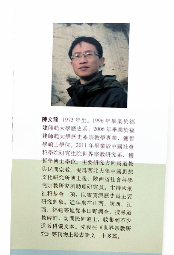 陳文龍,1973年生。 1996年畢業於福建師範大學歷史系,2006年畢業於福建師範大學歷史系宗教學專業,獲哲學碩士學位。 2011年畢業於中國社會科學院研究生院世界宗教研究系,獲哲學博士學位。主要研究方向為道教與民間宗教。現為西北大學中國思想文化研究所博士後,陝西省社會科學院宗教研究所助理研究員。主持國家社科基金一項,以靈寶派歷史為主要研究物件。近年來在山西、陝西、江西、福建等地從事田野調查,搜尋道教碑刻,訪問民間道上,收集到不少道教科書文本。先後在《世界宗教研究》等刊物發表論文二十多篇。
