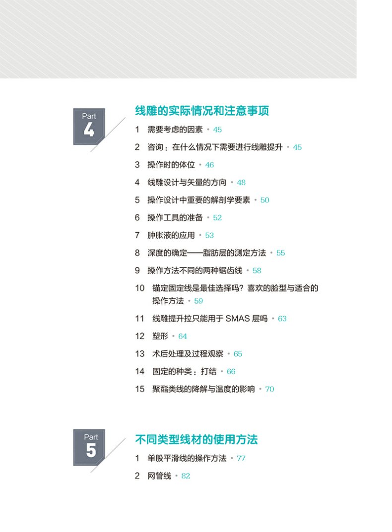 臉部埋線提升術是一種風靡全球的非侵入性微整形操作。本書首先介紹了線雕提升中需要了解的解剖學知識,包括皮膚支持韌帶、臉部脂肪結構特徵和頸部結構。與老化相關的線雕提升解剖學知識,包括SMAS層、韌帶,脂肪,頸部的解剖等內容。接著介紹了可吸收線的種類及特點,包括線的種類、歷史應用和未來發展等關於線材的知識。線雕的實際狀況及注意事項,包括術前的諮詢、需要考慮的因素,手術設計,器械準備消毒。不同類型線材的使用方法。實操章節詳細介紹了不同部位的埋線方法,各自的優缺點。隨後介紹了可能會發生的併發症及發生併發症時的處理方法。最後介紹了體部線雕,線雕與其他療法結合治療的技術。本書內容全面實用,對國內醫師提升線雕操作技能有很大的幫助。