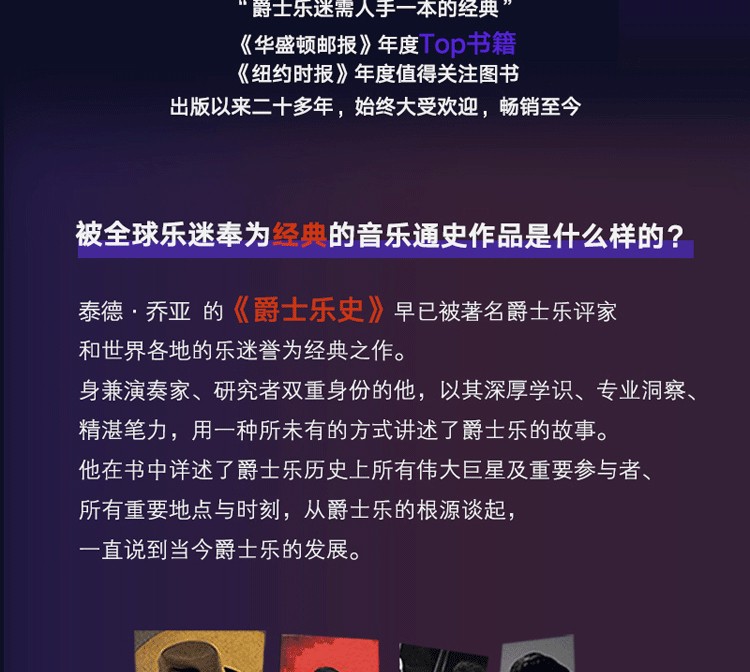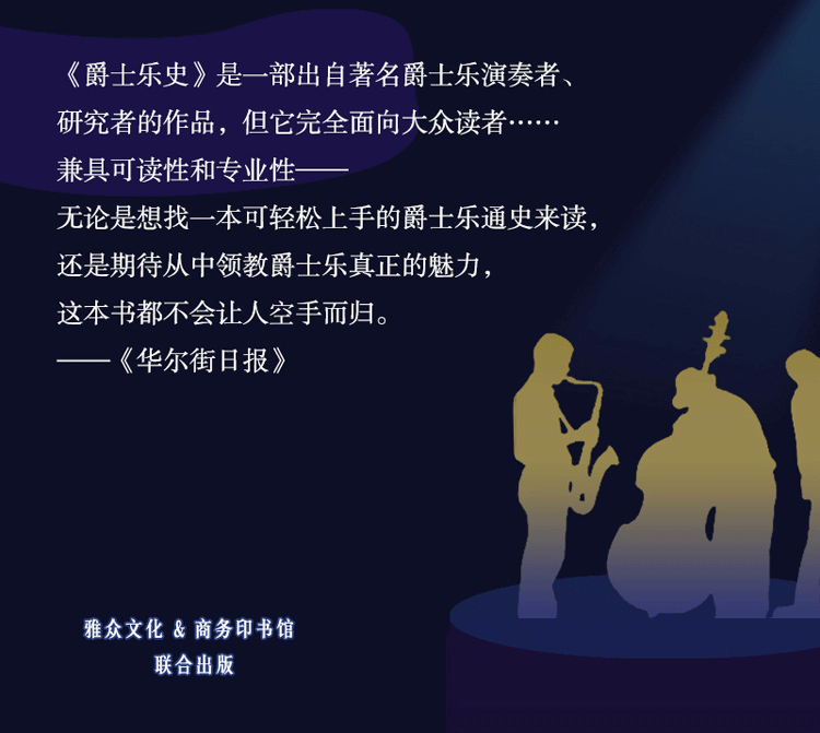 本書從19世紀爵士的起源講起,按時間順序、分階段介紹了爵士樂的發展、傳播、興衰的千姿百態。近距離觀察了爵士與古典、流行音樂等其他藝術形式的相互影響、碰撞,以及爵士的風格、流派、重要人物、樂隊,及其影響後世的作品。