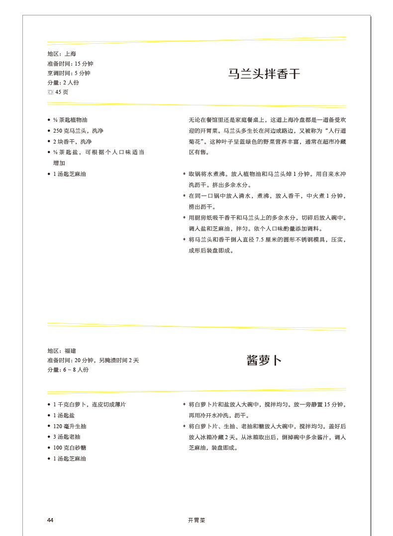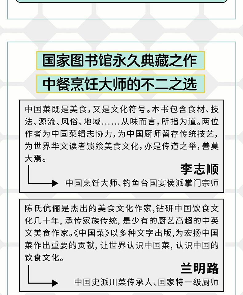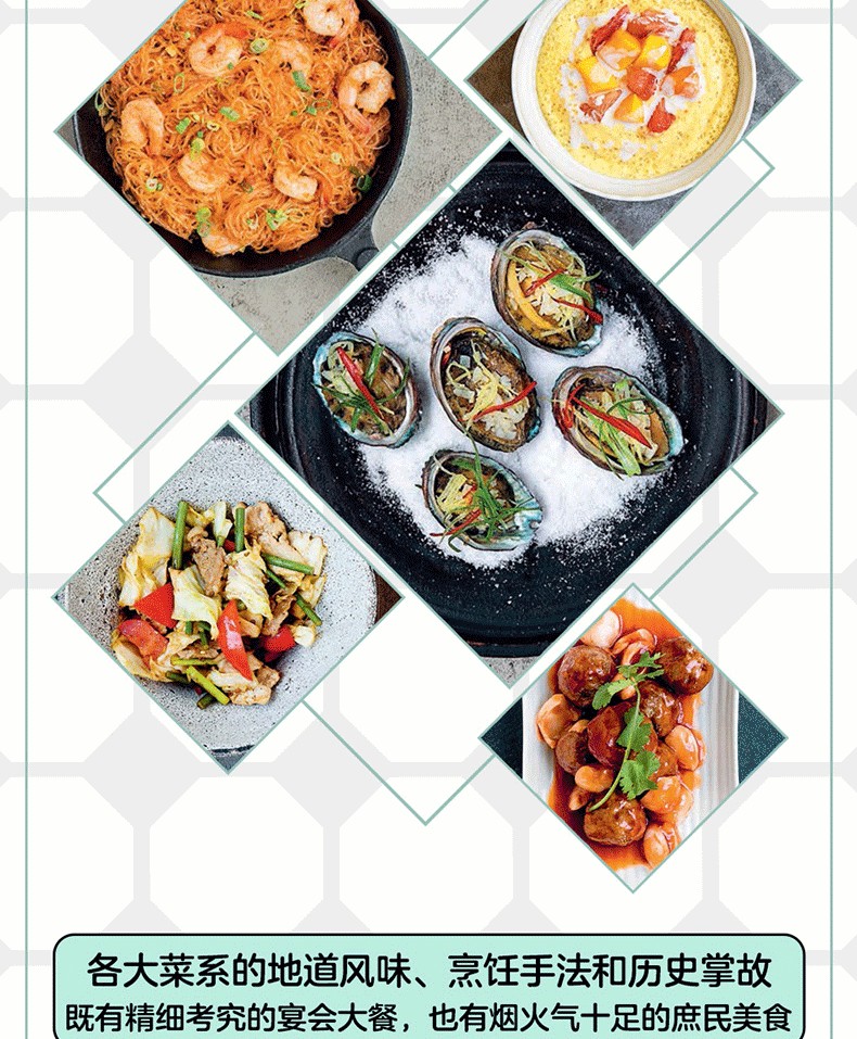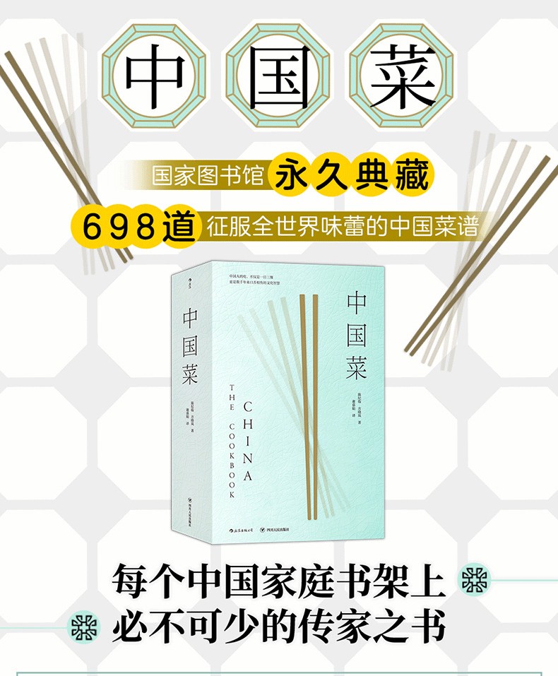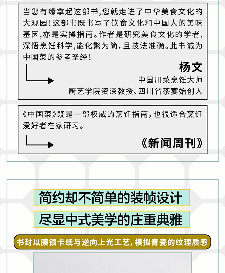 698道征服全世界味蕾的中國菜譜,涵蓋冷盤、肉菜、海鮮、細點、主食、湯羹……既有精細考究的宴會大餐,也有煙火氣十足的廬民美食。講解詳細,邏輯嚴謹,食材用量、火候與烹調時間全部明示。此外,書中也特別收錄米其林三星餐廳香港龍景軒、上海浦東文華東方酒店、香港香格里拉大飯店等名店主廚的私房食譜26道。