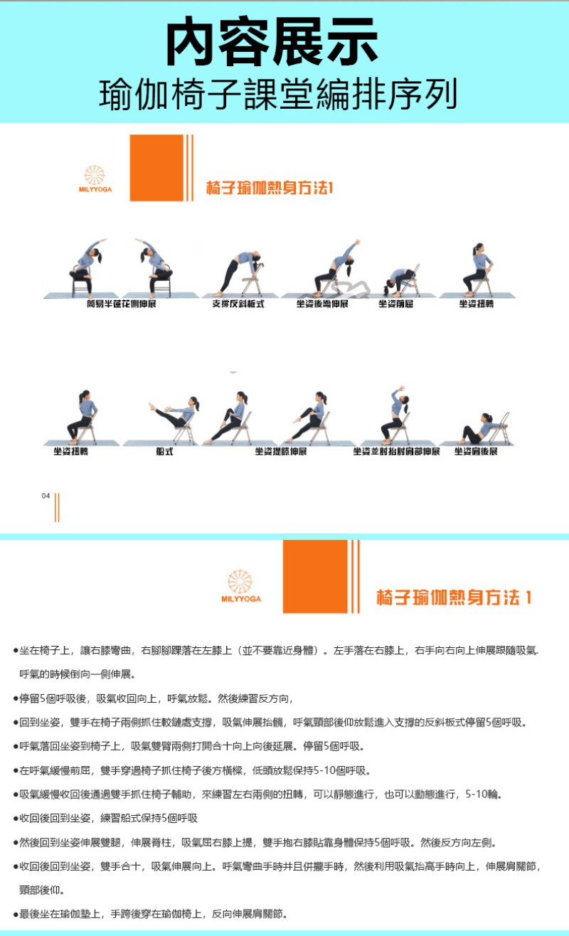 瑜珈排課序列含有:椅子的熱身方法-椅子陰瑜珈-椅子普拉提和90分鐘椅子瑜珈大課序列。