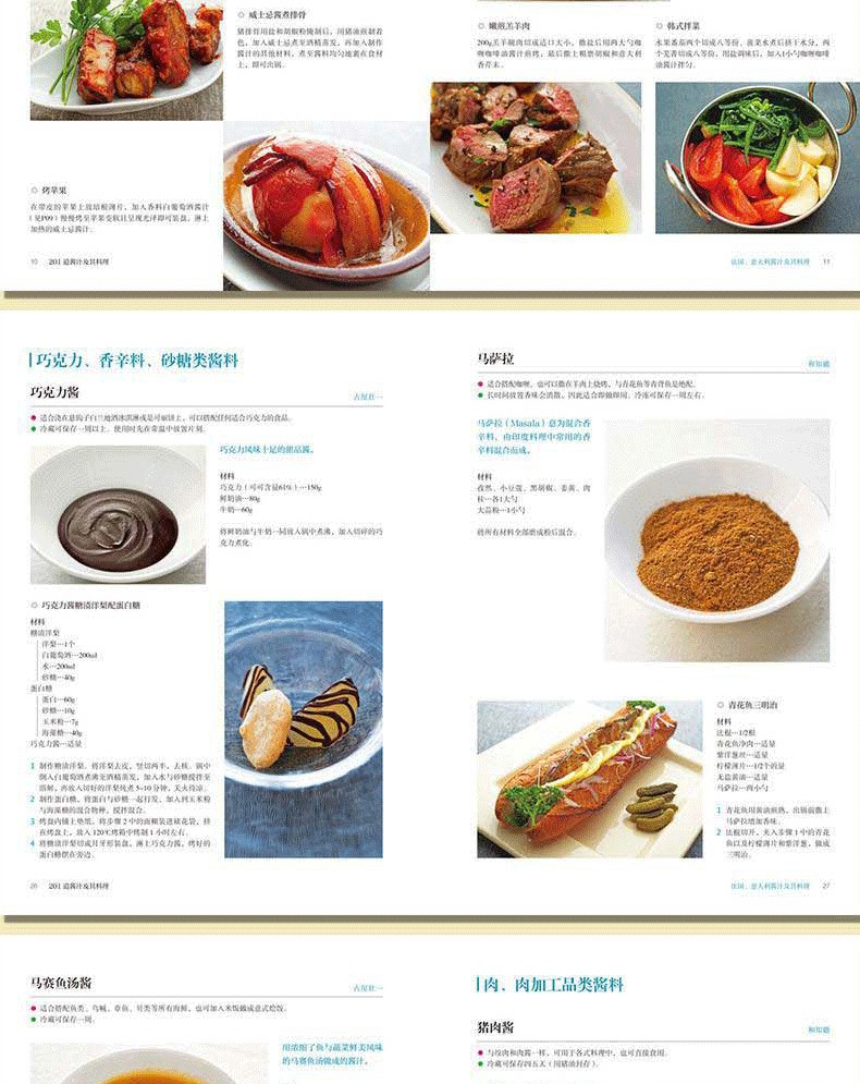 201種醬料調配,根據各國料理特點,按照材料和調製方法清晰分類,方便查找。與書中醬汁完美搭配的201種菜品,製作步驟清楚,是餐廳製作醬汁料理的絕佳參考。