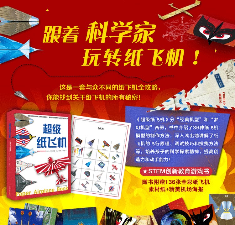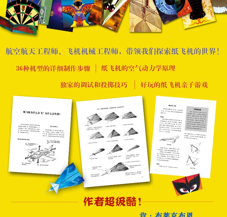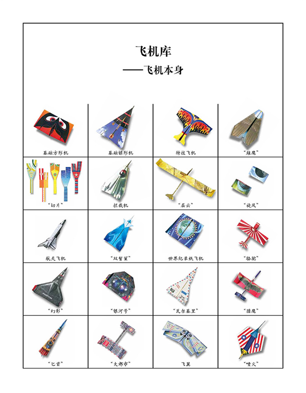 本套叢書分“經典機型”和“夢幻機型”兩冊,難度循序漸進,一共介紹了“伯爵”“雄鷹”“旋風”“幻影”等36種紙飛機模型的製作方法。書中深入淺出地介紹了紙飛機的飛行原理、調試技巧和投擲方法等,讓孩子在裁剪、粘貼和折疊的過程中,培養對科學研究的興趣和鑽研精神,激發孩子的想像力創造力,提高他們的空間思維能力和動手能力。
