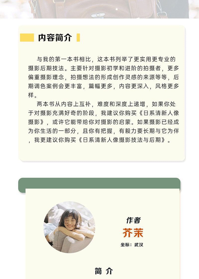 "1資深人像攝影師陳韜(西瓜呆毛汪)繼暢銷圖書《少女寫真日誌》之後攝影教程力作! 2知名人像模特櫻桃喵全程參與,全書出鏡! 3全彩印刷,無光銅紙張,近300頁超多乾貨內容! 4私房攝影、少女寫真,室內、戶外、各種場景各種風格一網打盡! "