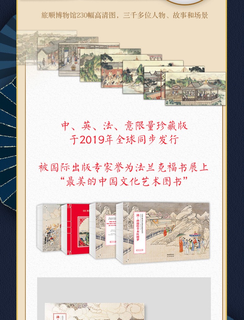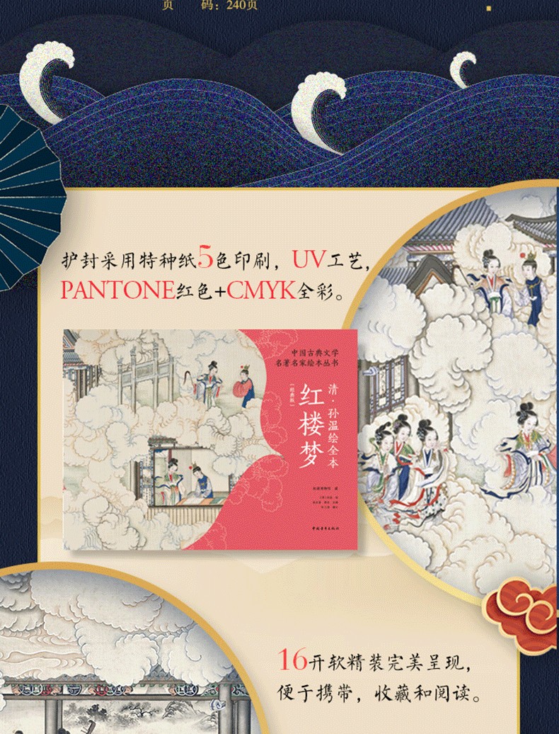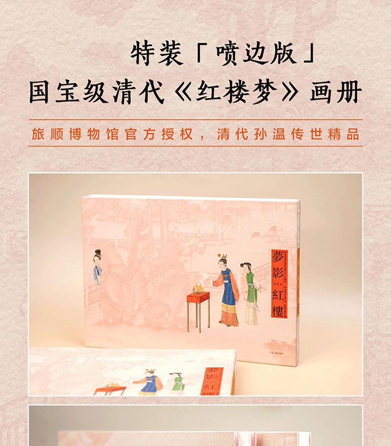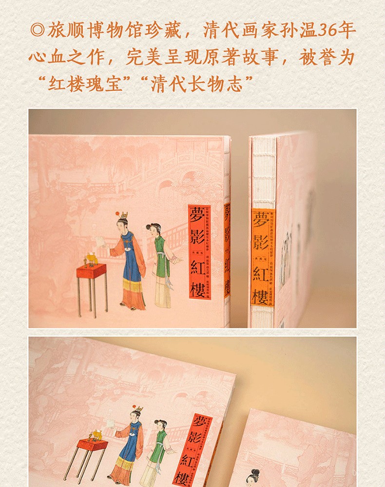 本書透過230幅絹本彩繪再現《紅樓夢》的主要故事情節、人物和場景。橫開本採用裸脊鎖線裝訂,可實現180度無障礙展開閱讀,內文仿古特種紙精確還原畫作色彩和細節。同時,書特聘請中國紅樓夢學會權威專家為每幅畫面撰寫文字,圖文交相輝映,形成一部「節本」《紅樓夢》,為讀者用最短的時間閱讀中國古典名著提供了難得的素材。 2019年,中國青年出版社與全球頂尖出版商合作出版了該書的中、英、法、意四個語種的限量珍藏版,創造了《紅樓夢》首次中、英、法、意四個語種同時出版的記錄。特裝刷邊版《清.孫溫繪全本紅樓夢》(經典版)保留了限量珍藏版的原有圖文,並以16開軟精裝的形式再次出版,同時精選經典場景圖對書進行刷邊,進一步提升收藏價值,讓更多的讀者有機會了解中國文化和《紅樓夢》這一文學巨著,並透過此書獲得一種美的閱讀感受。
