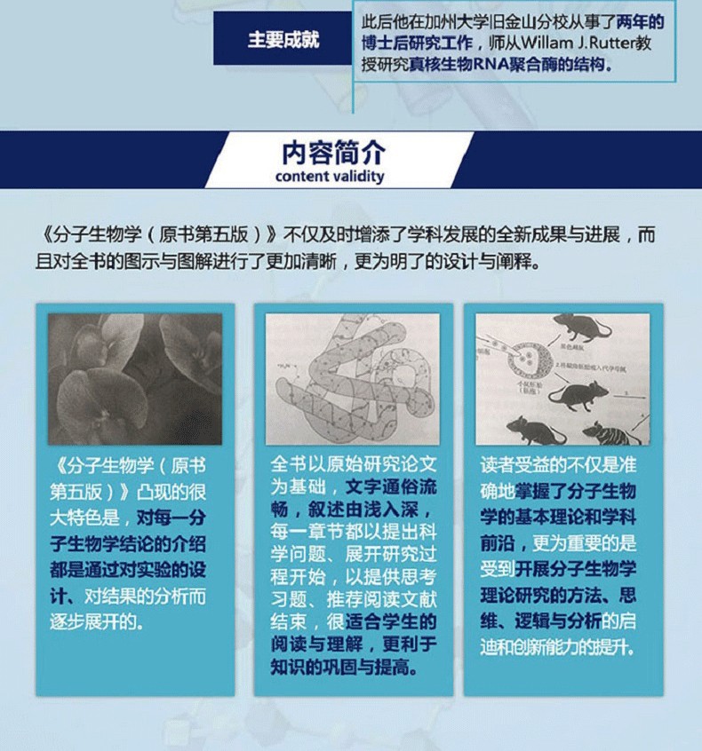 《分子生物學(原書第五版)》不僅及時增添了學科發展的全新成果與進展,而且對全書的圖示與圖解進行了更加清晰,更為明了的設計與闡釋。 《分子生物學(原書第五版)》凸現的很大特色是,對每一分子生物學結論的介紹都是透過對實驗的設計、對結果的分析而逐步展開的。全書以原始研究論文為基礎,文字通俗流暢,敘述由淺入深,每一章都以提出科學問題、展開研究過程開始,以提供思考習題、推薦閱讀文獻結束,很適合學生的閱讀與理解,更利於知識的鞏固與提升。讀者受益的不僅是準確地掌握了分子生物學的基本理論和學科前沿,更為重要的是受到進行分子生物學理論研究的方法、思維、邏輯與分析的啟蒙和創新能力的提升。