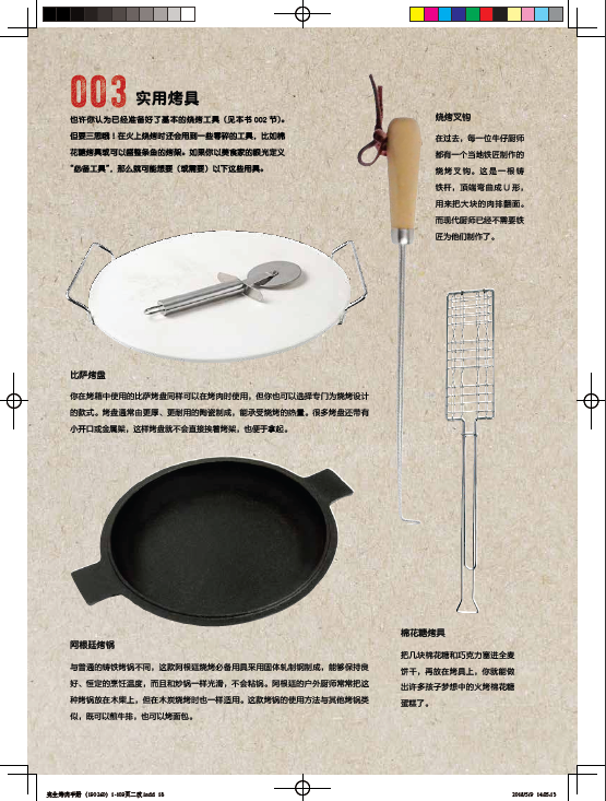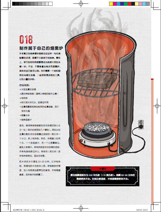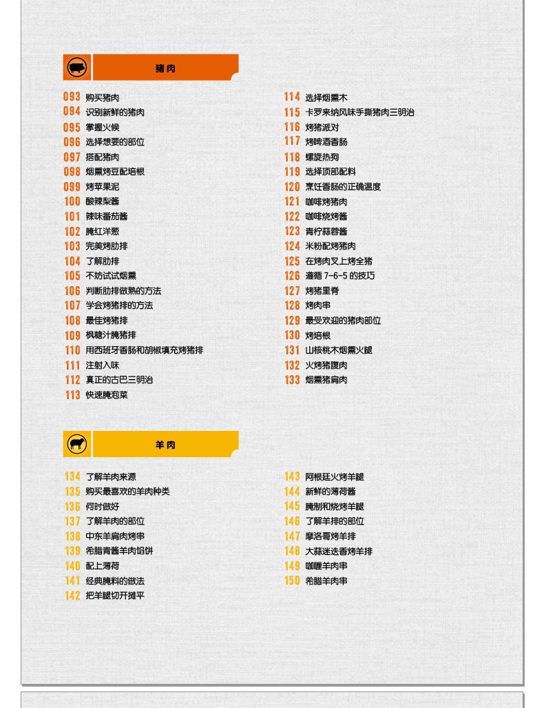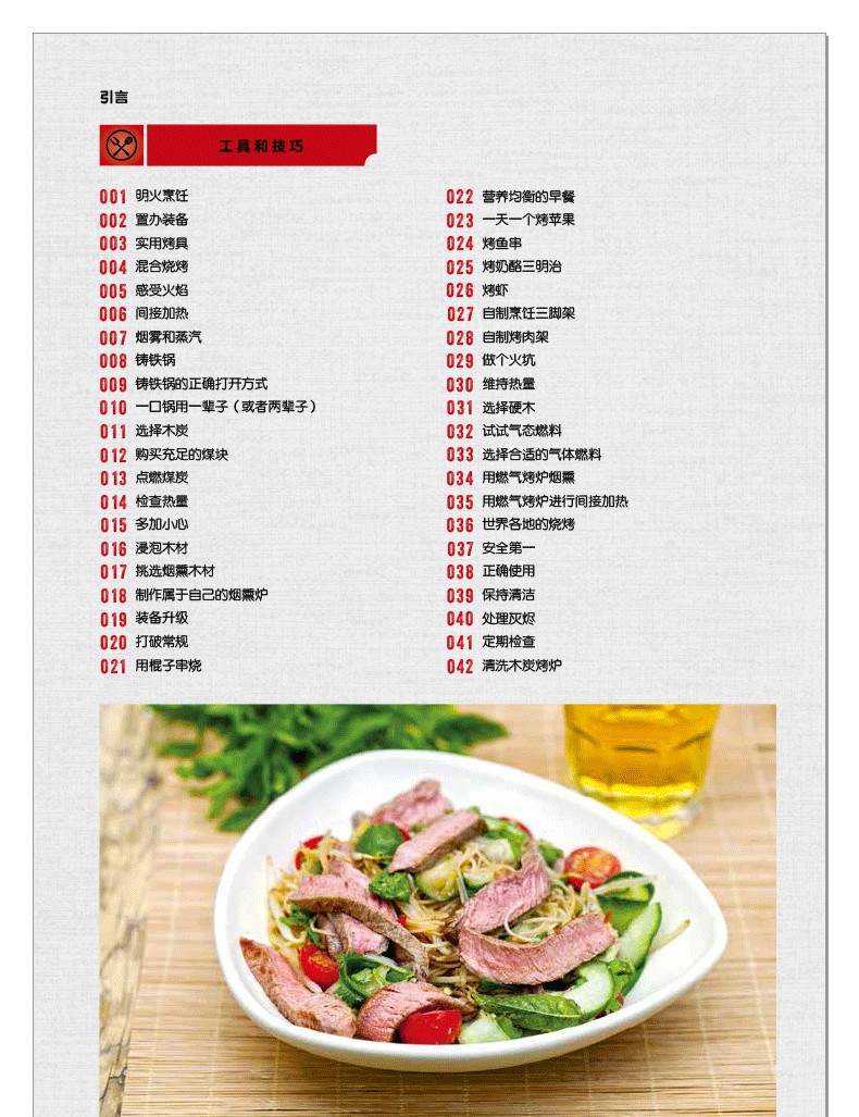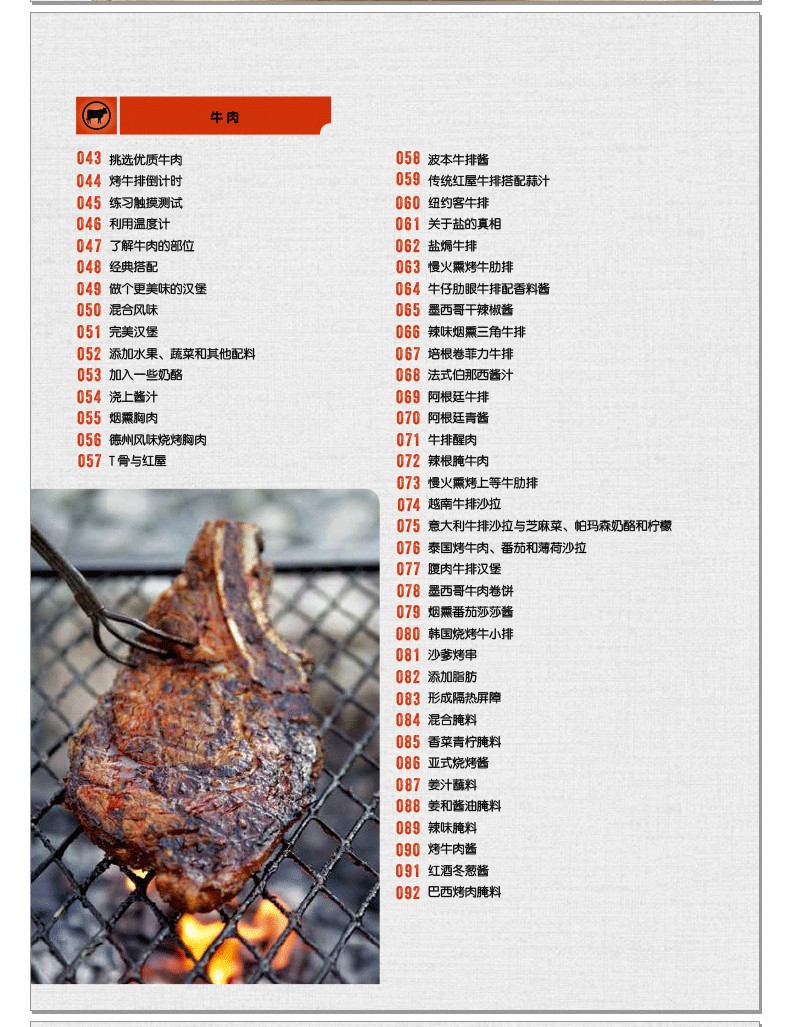 閃烤牛排、茶熏鴨胸肉、烤肉比薩、棉花糖蛋糕的食譜都能在這本書中找到。章節按照牛肉、豬肉、羊肉、家禽、海鮮分類,配以全面的工具和技巧介紹,比如揉搓、醃製、調味等方法,並輔以配菜和飲品的搭配建議。