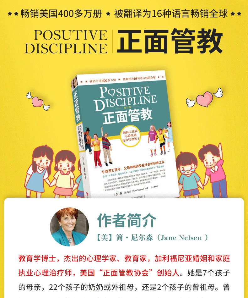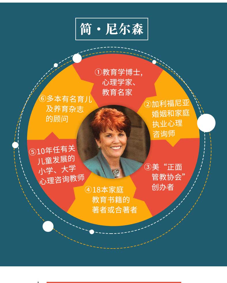 (美)簡‧尼爾森(JaneNelsen)教育學博士,傑出的心理學家、教育家,加州婚姻與家庭執業心理治療師,美國「正面管教協會」創始人。 她是7個孩子的母親,22個孩子的奶奶或外祖母,還是2個孩子的曾祖母。 曾經擔任10年的有關兒童發展的小學、大學心理諮詢教師。 她是18本著作的作者或合著者,也是許多有名育兒及養育雜誌的顧問。 她於2013年5月中旬至6月初展開“正面管教中國行”,在北京、上海、深圳三地的公開演講受到了中國父母的熱烈歡迎。