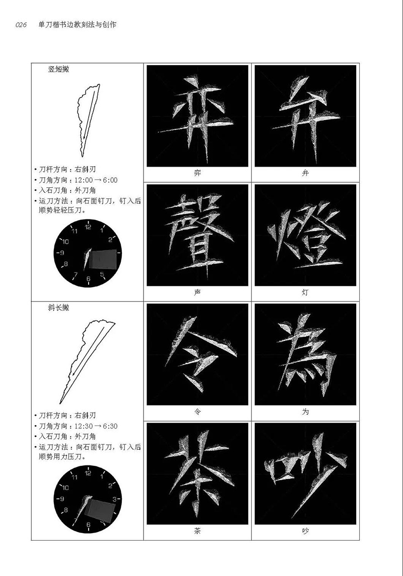 從放大的刀痕即可輕鬆判斷入刀的角度、方向及輕重等運刀要素。書中所選範字,從漢字的偏旁結構入手,將各類文字歸納匯總,使學習者能夠在熟悉範字的基礎上,舉一反三,迅速掌握單刀楷書的刻製方法。同時,將邊款中的紀年與常用字做了集中整理,方便直接學習與借鑒。可以說,它就是一本實用“邊款字帖”。