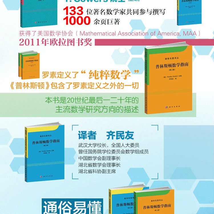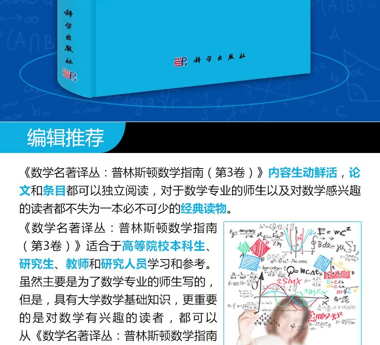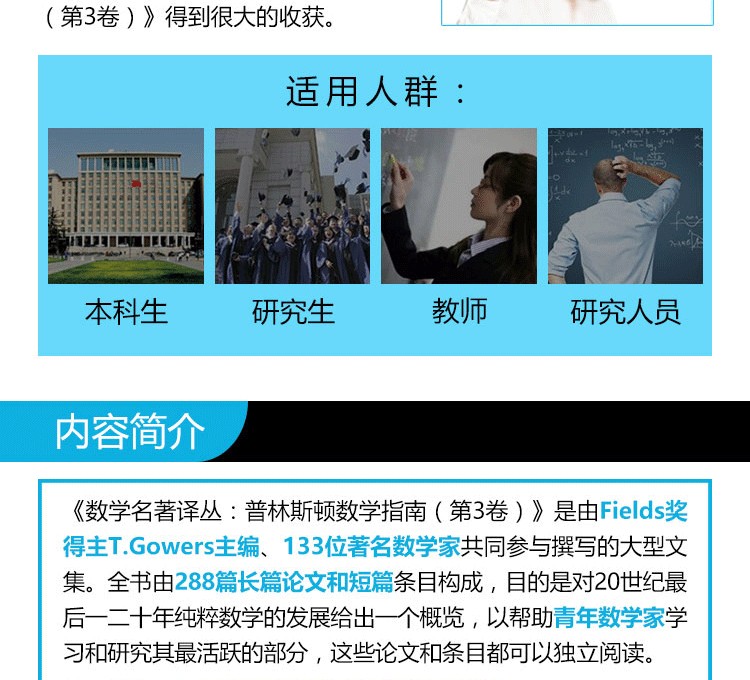 《數學名著譯叢:普林斯頓數學指南(第3卷)》是由Fields獎得主T。 Gowers主編、133位著名數學家共同參與撰寫的學科巨著,極具專業性,對20世紀最後一二十年純粹數學的發展給出一個概覽,總結過去指引未來,以幫助青年數學家學習和研究其最活躍的部分,本書內容生動鮮活,論文和條目都可以獨立閱讀,對於數學專業的師生以及對數學感興趣的讀者都不失為一本必不可少的經典讀物。