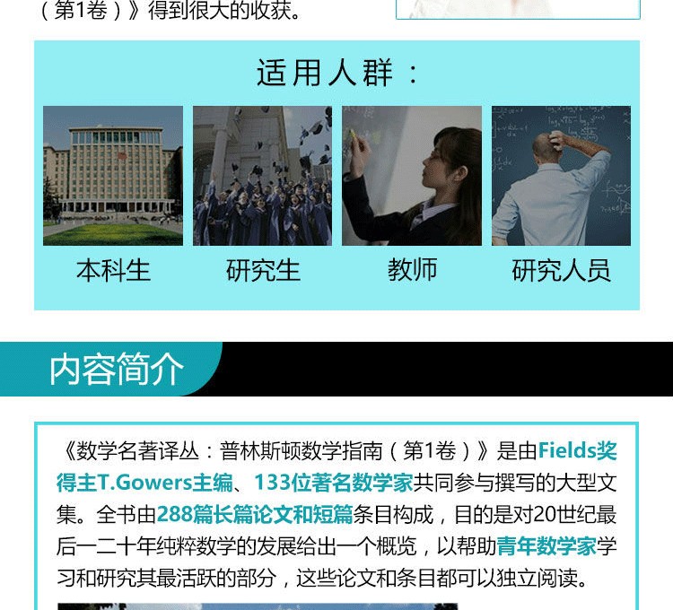 《數學名著譯叢:普林斯頓數學指南(第1卷)》適合於高等院校本科生、研究生、教師和研究人員學習和參考。雖然主要是為了數學專業的師生寫的,但是,具有大學數學基礎知識,更重要的是對數學有興趣的讀者,都可以從《數學名著譯叢:普林斯頓數學指南(第1卷)》得到很大的收穫。