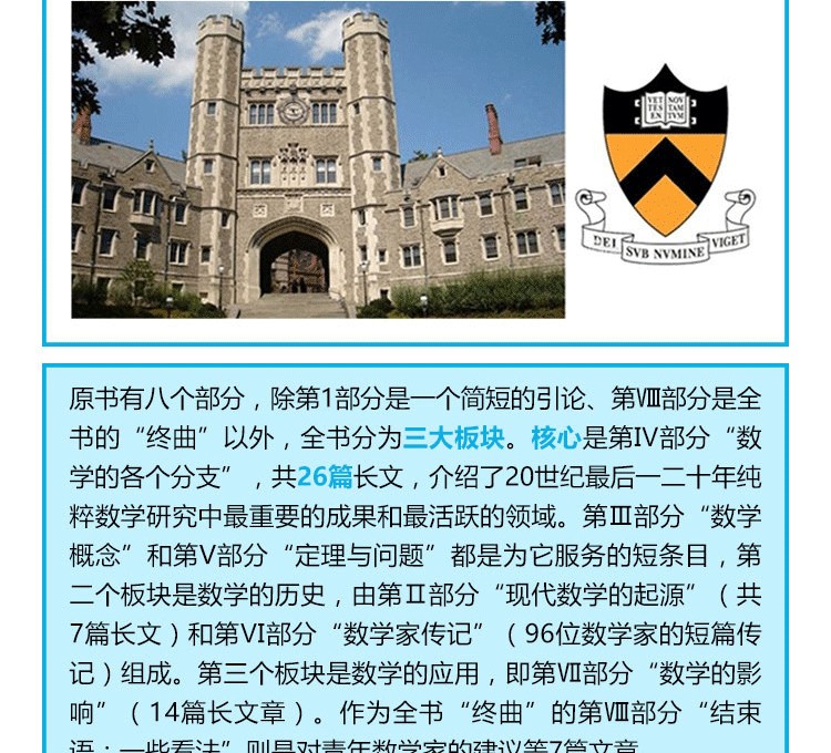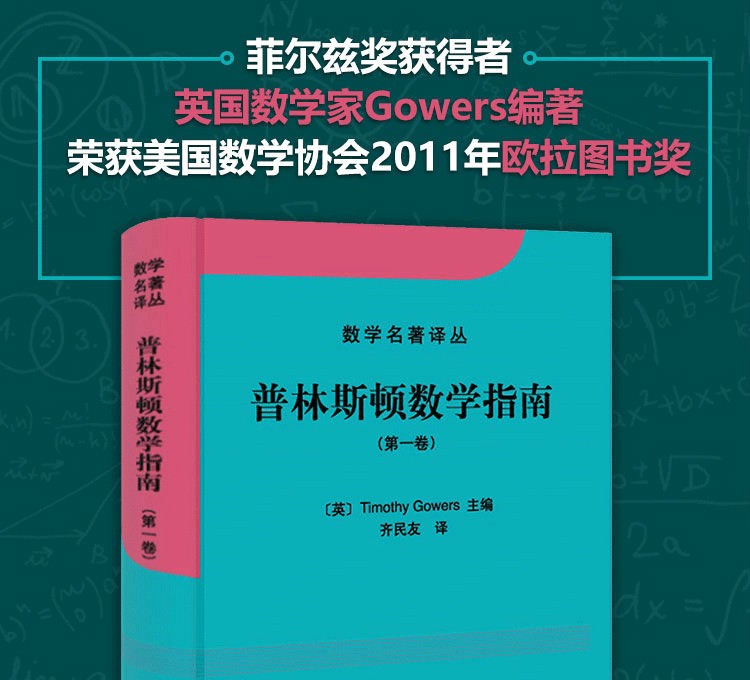 《數學名著譯叢:普林斯頓數學指南(第1卷)》是由Fields獎得主T。 Gowers主編、133位著名數學家共同參與撰寫的大型文集,全書由288篇長篇論文和短篇條目構成,目的是對20世紀最後一二十年純粹數學的發展給出一個概覽,以幫助青年數學家學習和研究其最活躍的部分,這些論文和條目都可以獨立閱讀,原書有八個部分,除第1部分是一個簡短的引論、第Ⅷ部分是全書的“終曲”以外,全書分為三大板塊,核心是第Ⅳ部分“數學的各個分支”,共26篇長文,介紹了20世紀最後一二十年純粹數學研究中最重要的成果和最活躍的領域,第Ⅲ部分“數學概念”和第V部分“定理與問題”都是為它服務的短條目,第二個板塊是數學的歷史,由第Ⅱ部分“現代數學的起源”(共7篇長文)和第Ⅵ部分“數學家傳記”(96位數學家的短篇傳記)組成,第三個板塊是數學的應用,即第Ⅶ部分“數學的影響”(14篇長文章)。作為全書“終曲”的第Ⅷ部分“結束語:一些看法”則是對青年數學家的建議等7篇文章。