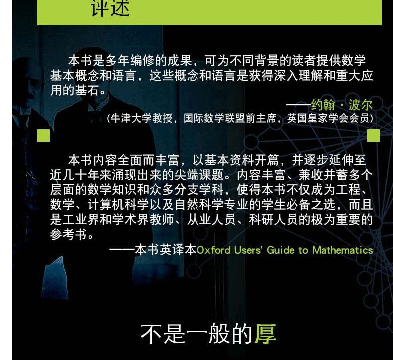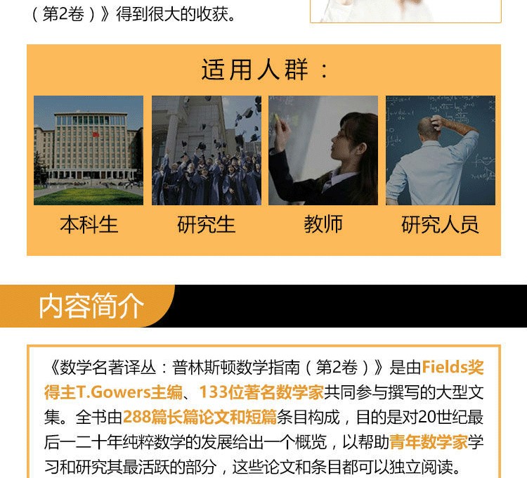 《數學名著譯叢:普林斯頓數學指南(第2卷)》內容生動鮮活,論文和條目都可以獨立閱讀,對於數學專業的師生以及對數學感興趣的讀者都不失為一本必不可少的經典讀物。