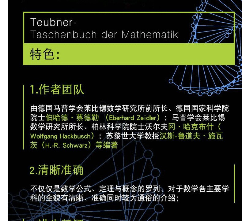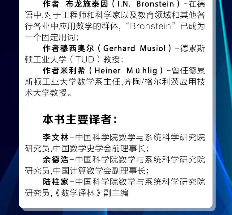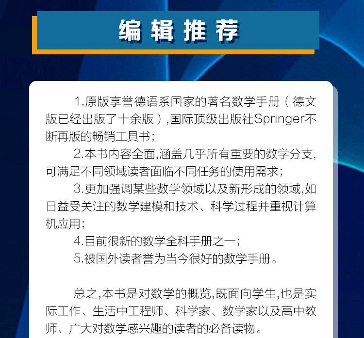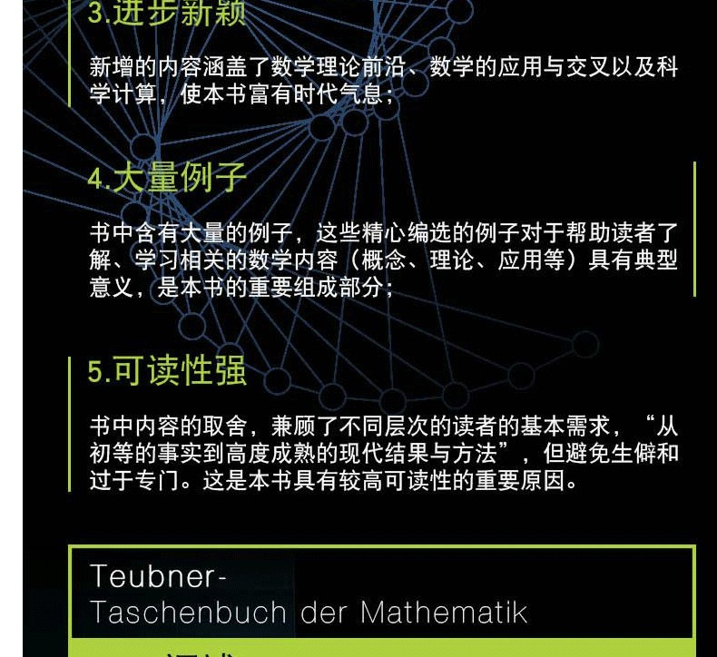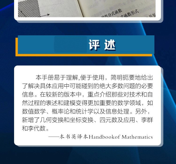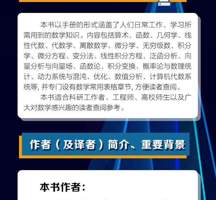 《數學指南:實用數學手冊》是一部暢銷歐美的數學手冊,內容全面而豐富,涵蓋分析學、代數學、幾何學、數學基礎、變分法與優化、概率論與數理統計、計算數學與科學計算、數學史。 《數學指南:實用數學手冊》中收錄有大量的無窮級數、特殊函數、積分、積分變換、數理統計以及物理學基本常數的表格;此外還附有極為豐富的重要數學文獻目錄。