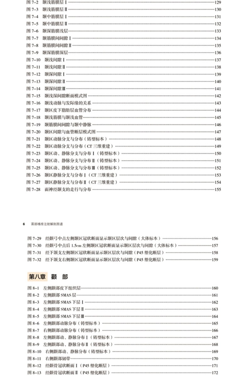 《面部精準注射解剖圖譜》是一本內容詳盡、標本層次結構清晰的實物圖譜。本書首先通過新鮮標本的動、靜脈灌注後,根據微注射的臨床需求在面部分部位進行了逐層解剖,拍攝了大量視角獨特的實用的實物照片,並且本書還利用血管鑄型技術、三維重建技術等獲得了面部動脈和靜脈分佈的全貌。 P45斷層塑化技術是的斷層標本製作技術,本書應用該技術清晰的顯示了面部的層次,尤其是完整的展示了SMAS層。同時本書繪製了精美的標本示意圖,使晦澀難懂的部分更加清晰。該書從籌備到完稿歷時1年半,*終精選照片、圖片240餘幅,圖譜內容詳實、圖片清晰、圖解充分,編排細緻,力求全面呈現面部的解剖層次和血管分佈,從而為面部微注射技術有效地提供解剖基礎。希望本書能夠成為廣大醫學生、醫學美容教育工作者和醫學美容臨床醫生的得力助手。