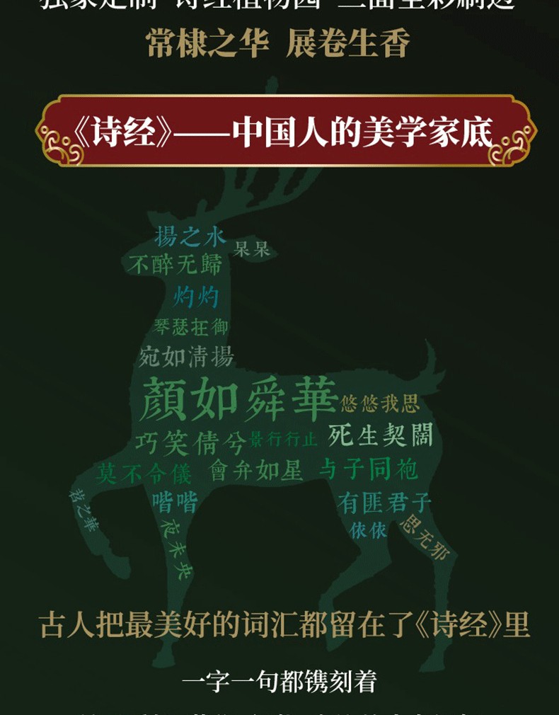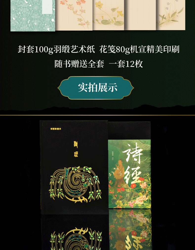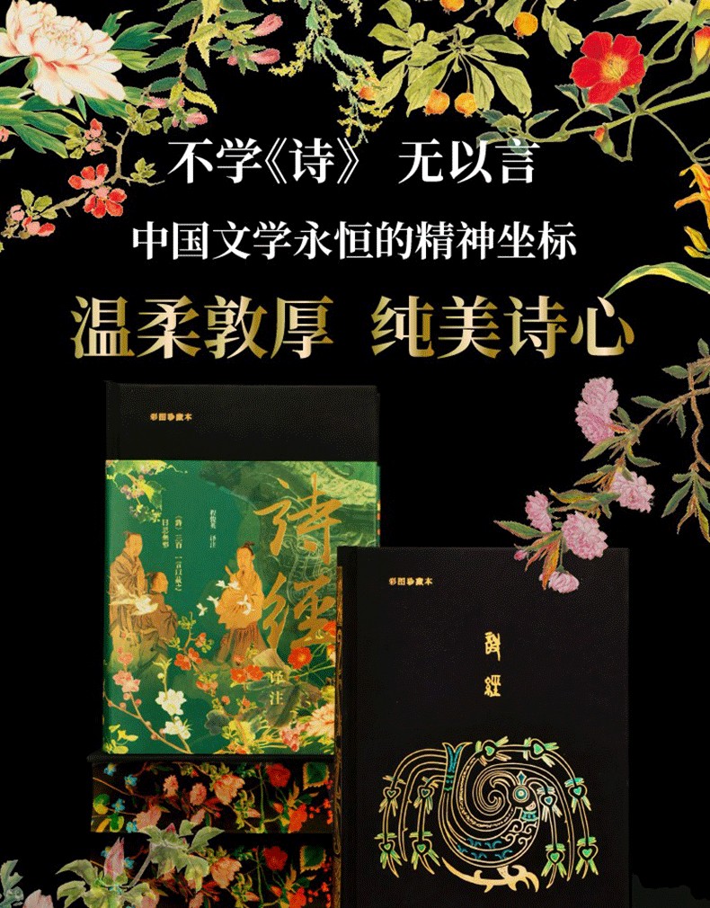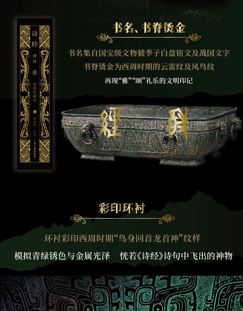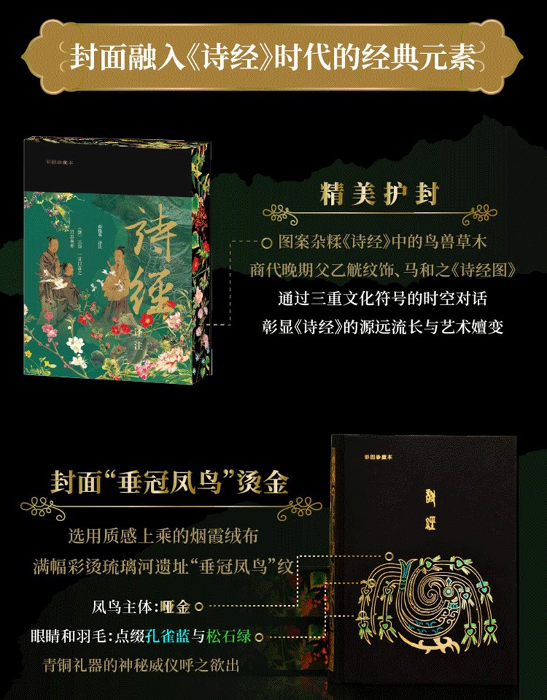 護封圖案雜糅《詩經》中的鳥獸草木、商末周初的父乙觥、「南宋四大家」馬和之《詩經圖》等歷代圖像及文物元素,彰顯《詩經》文化的源遠流長與藝術嬗變。