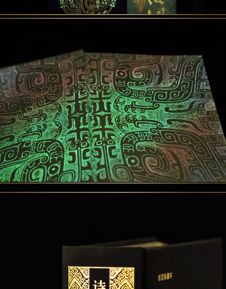 書脊燙金為西周時期的雲雷紋及鳳鳥紋,環襯圖案則為「鳥身回首龍首神」紋樣,在光線下流轉出青綠銹色與華麗的金屬光澤。