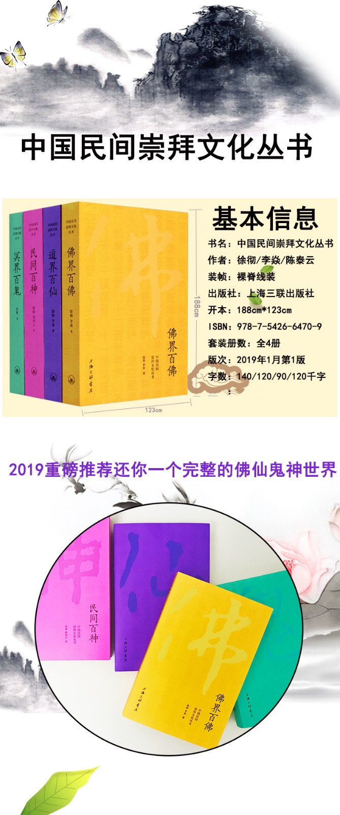 「中國民間崇拜文化」叢書共四冊,分別是《佛界百佛》《道界百仙》《冥界百鬼》《民間百神》,是中國著名晚晴史學者徐徹先生研究佛仙鬼神的代表作。文字乾淨、生動、典雅,帶給人讀小說的愉悅。這套書或許不能算是開創性的著作,但對一百個佛仙鬼神的記錄,不僅在古書的基礎上作了大的補充,還寫出了自己的味道,在當下極為稀有,可稱為無二之作。 《道界百仙》列創世神、天尊神、星宿神、遊仙神、真人神、護法神、佑民神、居家神、山澤神和匠作神等共一百仙。