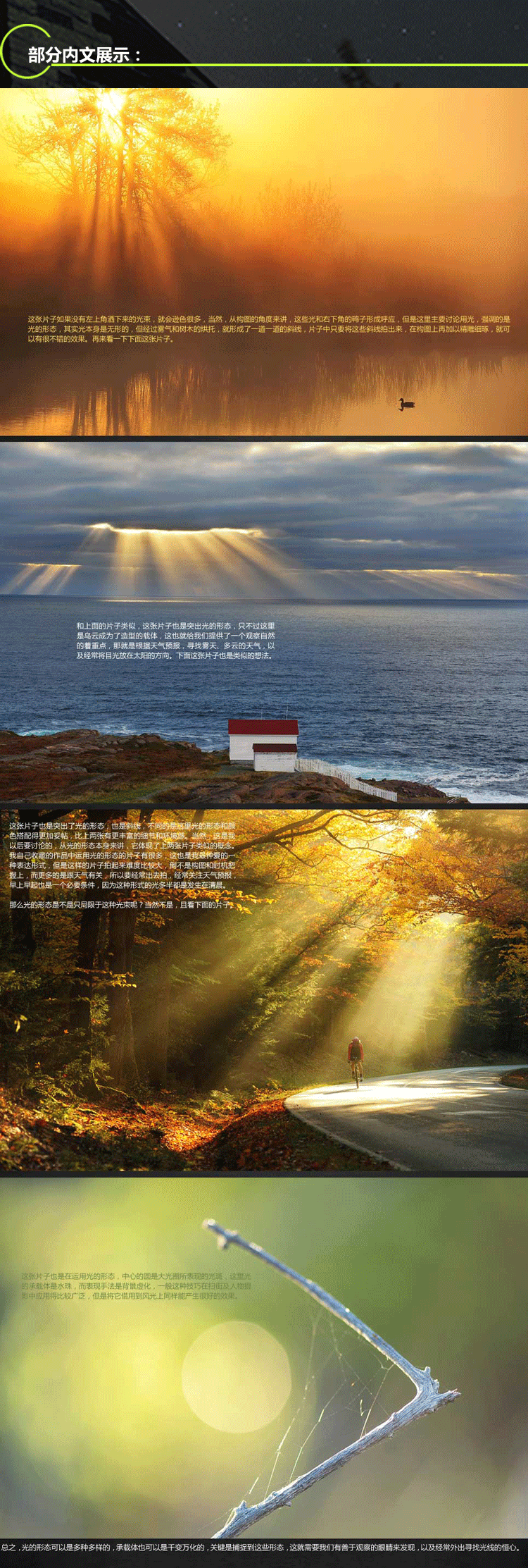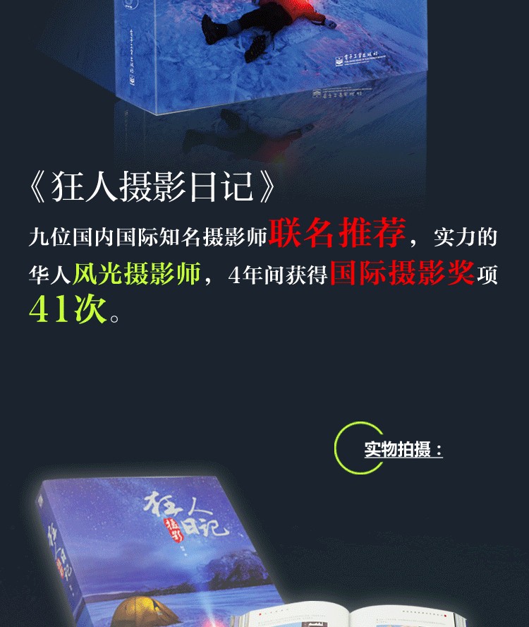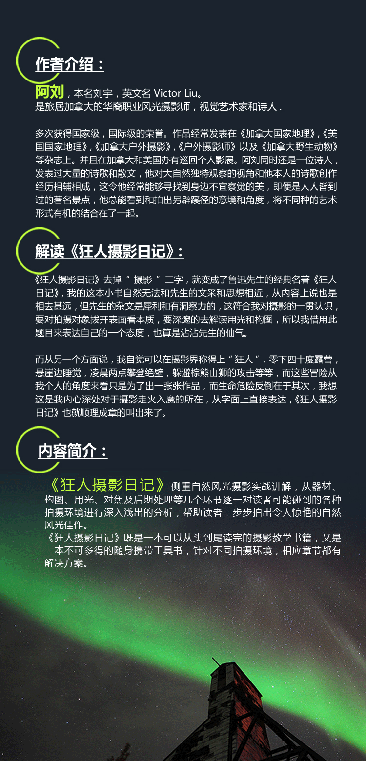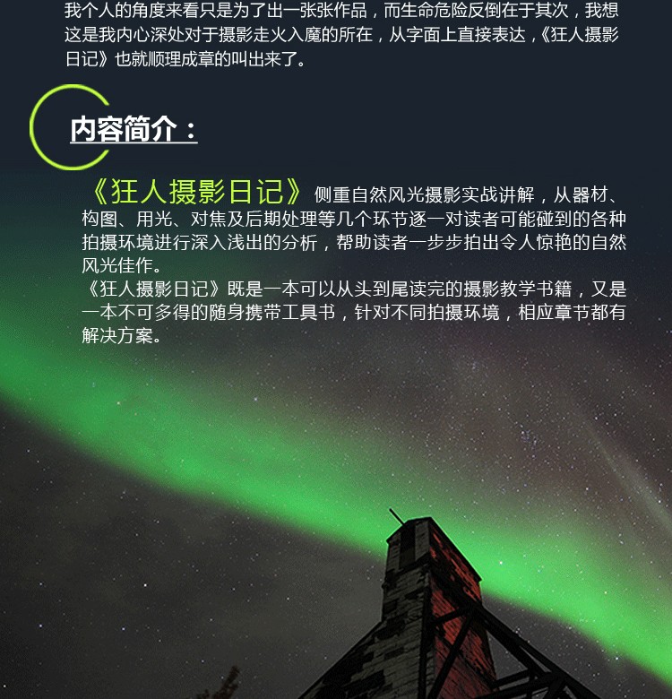 《狂人攝影日記》第2版側重自然風光攝影實戰講解,從器材、構圖、用光、對焦及後期處理等幾個環節逐一對讀者可能碰到的各種拍攝環境進行深入淺出的分析,幫助讀者一步步拍出令人驚豔的自然風光佳作。 《狂人攝影日記》既是一本可以從頭到尾讀完的攝影教學書籍,又是一本的隨身攜帶工具書,針對不同拍攝環境,相應章節都有解決方案。隨書光盤中包含了書中部分作品的後期處理視頻教程。