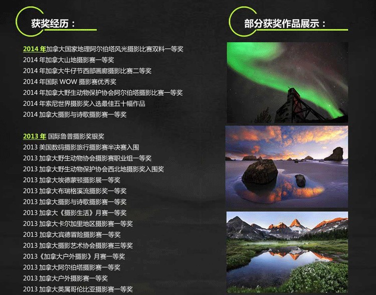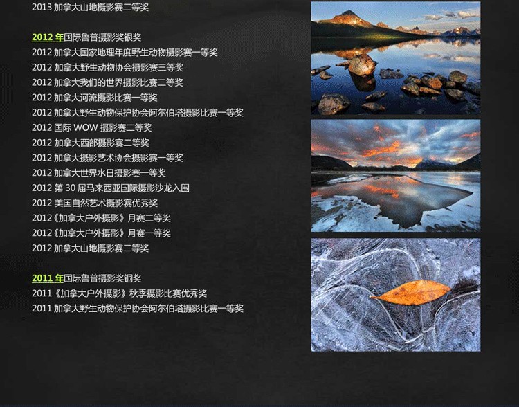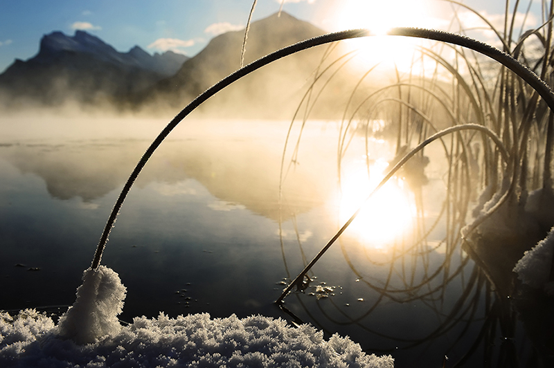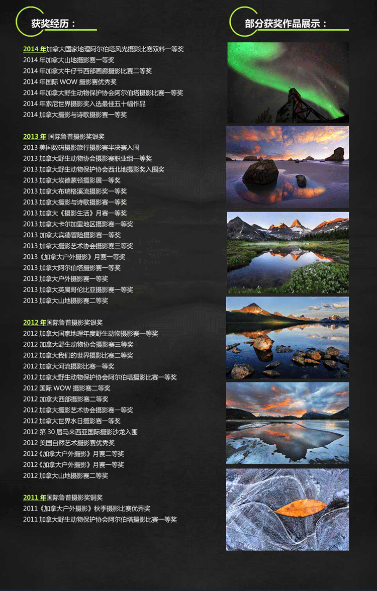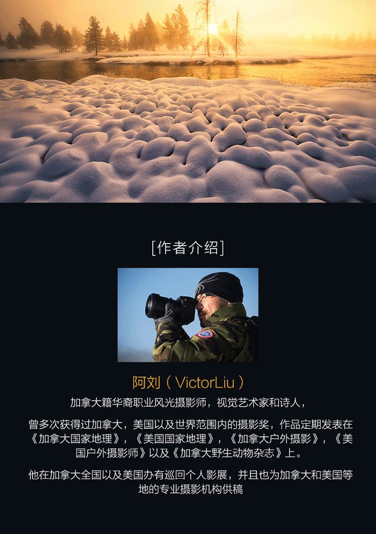 從阿劉的攝影作品中可以看到他心靈感受的另一面,他對這個世界的深刻理解,理解它的廣袤,它的微妙,從而產生攝影所需的洞察力。可以在最有效的時刻,採用最具眼光的方式拍攝主體,以傳達強烈的本質意義和深刻的內在含義。靜下心來揣摩阿劉的影像,我個人最喜歡的是冬天裡的冰雪世界,這個季節也是我最愛的攝影黃金季節。從他的冬季創作作品看,他對此充滿了激情,居住加拿大西部卡爾加利的他,一小時內自駕車可以進入加拿大最美的班夫和賈斯泊國家公園園區。他隻身一人,多次往返其中,睡帳篷,吃乾糧,獨自一人一待就是數日,這已是家常便飯。在冰天雪地寒冷的環境中,親切地接近感受到的情感,被巧妙地用於冰冷的相機軀殼和鏡頭中記錄著光影交織的溫暖畫卷。