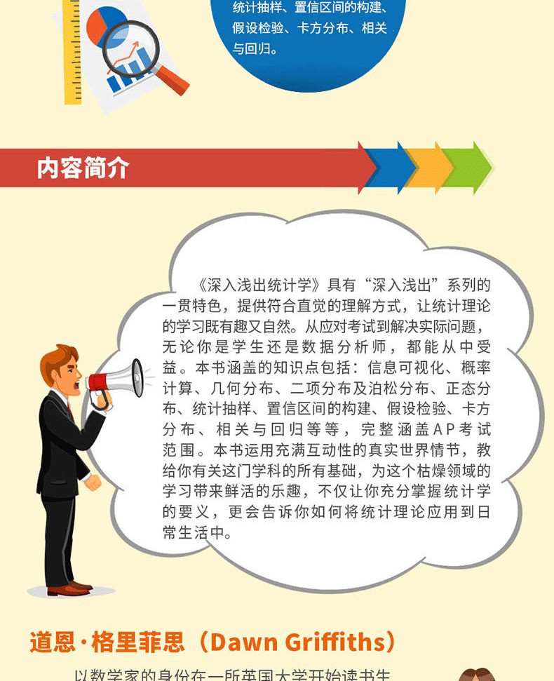 道恩·格里菲斯著的《深入淺出統計學》具有「深入淺出」系列的一貫特色,提供符合直覺的理解方式,讓統計理論的學習既有趣又自然。從應對考試到解決實際問題,無論你是學生還是數據分析師,都能從中受益。本書涵蓋的知識點包括:資訊視覺化、機率計算、幾何分佈、二項分佈及泊松分佈、常態分佈、統計抽樣、信賴區間的建構、假設檢定、卡方分佈、相關與迴歸等等,完整涵蓋AP考試範圍。本書運用充滿互動性的真實世界情節,教你有關這門學科的所有基礎,為這個枯燥領域的學習帶來鮮活的樂趣,不僅讓你充分掌握統計學的要義,更會告訴你如何將統計理論應用到日常生活中。