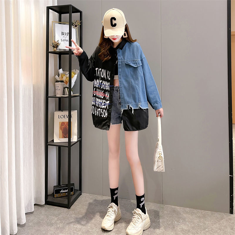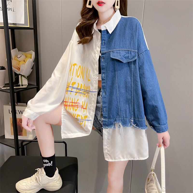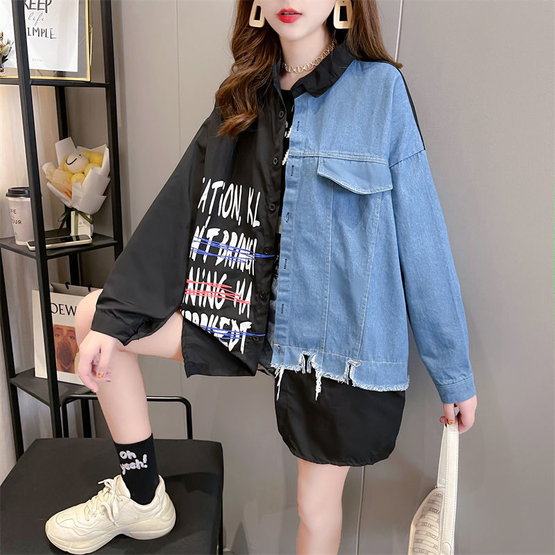 韓版設計感牛仔拼接薄款襯衫 新款寬鬆大碼女裝上衣