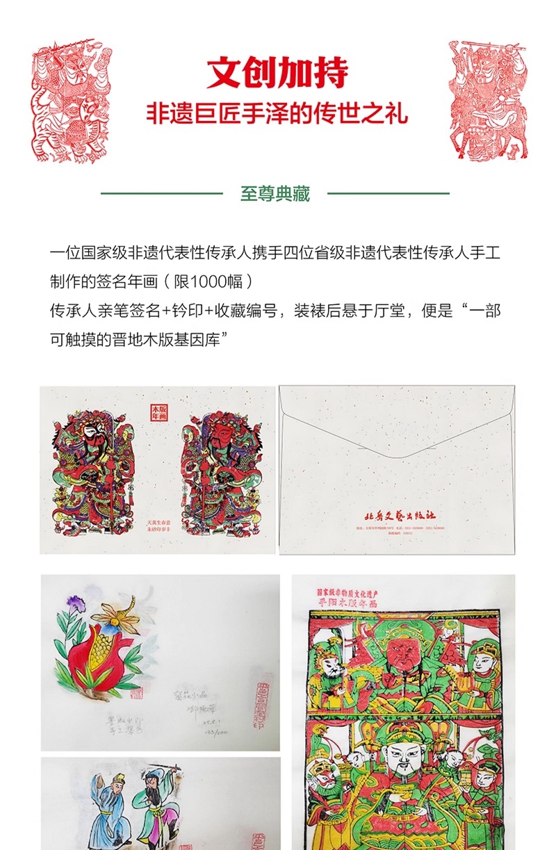 5. 「文化典藏 非遺活化傳承」屬性 系統性學術梳理: 首次以時間線整合山西木版年畫圖像譜系,涵蓋宋元(平陽古版)至近現代(魯藝新年畫運動)的演變脈絡;珍稀史料收錄:獨家呈現黑水城土版原版圖版收藏「舊版收藏品:現存:30年木版收藏品新版原版;突破傳統文獻圖錄的靜態展示,透過365天」日讀一畫」的互動設計,實現」非遺即生活」的沉浸式體驗。