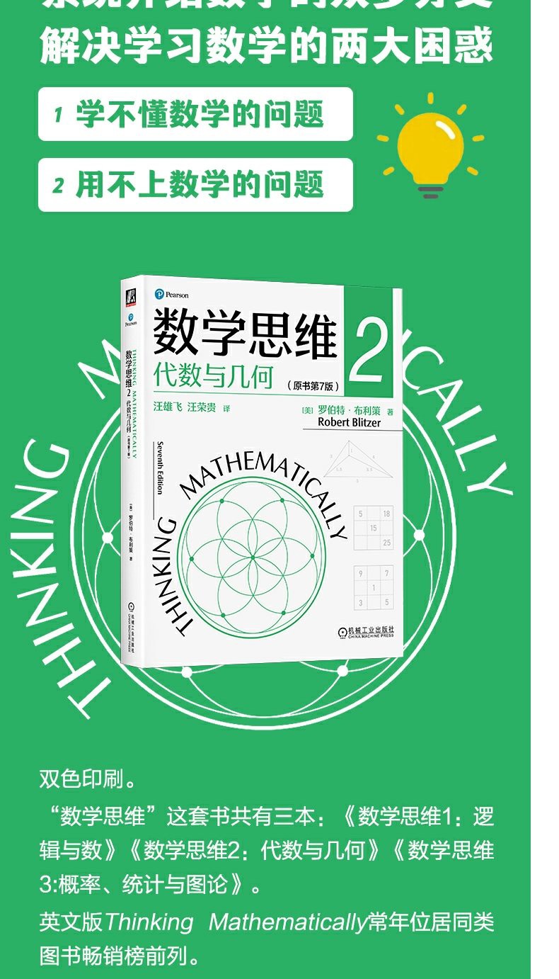 本書是一本數學普及讀物,想解決數學學習者的兩大問題:學不懂數學的問題和用不上數學的問題。針對讀者面臨的這兩個問題,書中用了大量生活中的案例系統性地介紹了初等數學思維,這在國內比較少見。因此,本書適合初高中生、人文社科類的大學生以及任何對數學感興趣的讀者。本書十大看點:1.通過分類和歸納信息來整理和安排日常生活2.使用邏輯來評價別人的論斷,並更有效率地發表自己的觀點3.理解前沿技術與古老數字表示系統之間的關係4.讀懂新聞中的數字,認識國債,理解 1 萬億元究竟是多少錢5.使用數學模型來直觀地理解事物,包括幽默與歡笑對人生的積極影響6.使用諸如存款、貸款和投資等基本概念來實現理財目標7.使用幾何來學習你所在世界的形狀,培養你對自然形狀和美的欣賞眼光8.理解統計學的基礎以及人們是如何使用數字做決定的9.理解民主政治的投票悖論10.使用圖論來分析人們是如何使用數學來解決商務問題的