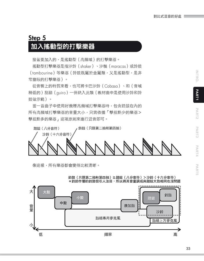 ●日本人氣編曲講座精華大集結: ⊙從單項基礎到整體合奏,4大樂器編曲原則全方位掌握 ⊙鼓組對照表+鋼琴卷軸+五線譜,譜例豐富好理解 ⊙概念圖解+要點彙整+音檔聆聽,多管齊下,學習最有效 ⊙技術本位最優先,使用軟體類型不受限 「單聽吉他樂句很棒!但整體搭配起來卻不出色……」 「真希望音樂一下立刻氣派十足,令人印象深刻!」 編曲有如穿搭的工夫,整體必須協調飽滿而不亂,層次鮮明有亮點,而且,有型有款! 如何打造樂曲的律動感?過門式樂句怎樣才能和主旋律相互輝映、又有特色?該如何安排各項樂器之間的關係和層次,才能讓彼此巧妙地搭配、整合? 現為日本專業音樂人、並舉辦人氣音樂講座的作者,以最普遍常見的流行樂團編制,針對鼓組、貝斯、吉他、鋼琴4大樂器,逐一解析各項要訣,提供你條理分明、井然有序的學習捷徑。打開本書,你將學會: ●「編曲的加-減-乘-除」應用方法 ⊙加法(加上充足的聲音) ⊙減法(去除不需要的聲音) ⊙乘法(透過聲音的組合來增強效果) ⊙除法(抑制其他聲音以凸顯某個聲音) ●華麗編曲的製作重點 ⊙明快節拍 -鼓組:中-低音域的重音、高音域的節奏 -貝斯:以根音和五度音為主 -吉他:配合基本律動進行刷奏 -鋼琴:只靠左手就做出基本律動 ⊙可哼唱樂句 -控制聚焦度的3大支柱:節奏-動向-聲音的使用方式 -間隙樂句:分為2種,以吉他和鋼琴為主 -背景樂句:以分解和弦為主 -鼓組過門:需考量音高的動向 ⊙樂團合奏 -綜效的強化:善用齊奏、合音、同一節奏,細節更完美 -優先性的確立:微調各部分的聚焦度次序,層次更分明●音樂人專業推薦 姚小民(旺福樂團主唱兼吉他手) 3R2(作曲家、編曲家、DJ) Frank(DigiLog聲響實驗室創辦人) Sam Lee(指北針音樂負責人、Apple官方認證Logic Pro講師、搖滾/爵士樂團bass手)●日本讀者實證推薦 -原本得透過長期進行樂曲分析才能學到的方法,在這本書中一次就能學到。尤其是PART2有關「聚焦度」的掌握方法非常好懂。適合已有作曲經驗、開始覺得需要「編曲」的人。 -我習慣同時進行作曲和編曲,覺得從本書最後的附錄開始讀也很好! -對新手當然很有幫助,對那些在錯誤中學習、想升級到中-上級的人來說同樣必備,有助於回到原點釐清編曲的基礎和本質!作者介紹 作者簡介 熊川浩孝 熊川ヒロタカ,Kumagawa Hirotaka 作曲家、編曲家兼音樂講師。2010年4月起以作曲家兼編曲家的身分開始音樂活動,替許多音樂人創作、編過各種類型的樂曲。本身參與編曲的Royz第9張混音單曲「LILIA」在Oricon單曲單週排行上曾獲得第7名。2014年加入了Rittor Music出版的《圖解混音入門》(石田剛毅著,中譯本由易博士出版社於2016年出版)一書教材曲「Liner Notes」的製作團隊。現在致力於活用自己作曲和編曲的經驗,透過音樂講座栽培後進。石田剛毅 石田ごうき,Gohky Ishida I / O MUSIC株式會社的董事長(代表取締役社長),也是作詞作曲家、編曲家和音樂教育講師,同時還擔任音樂界的專業顧問。平時使用Cubase系統製作音樂。曾任職於島村樂器小倉分店、廣播電台的音響及企劃業務部門。還住在鄉下時以自營音樂事業者的身分於2008年4月創業,透過CD製作和音樂教學等自立門戶。由於在客戶之間擁有極高的推薦率和回客率,因此穩定扎實地擴大業務。2010年春天,因想追求新的發展而單身赴東京,並僅以短短4個月的時間便快速將事業扶上軌道。2011年春天起為想成為「自營音樂事業者」的人設立了「如何成為自營音樂事業者」培訓課程,積極培育後進。2013年10月將工作室法人化,成立I / O MUSIC株式會社。2014年出版了第一本教材《圖解混音入門》(在日本由Rittor Music出版社出版,中譯本由易博士出版社於2016年出版)。獲得許多對於混音感到困擾的數位音樂創作者大力支持,銷售與回響都相當熱烈!譯者簡介 陳弘偉 Ernie Chen 音樂人。音樂啟蒙自Yamaha Electone三排式電子琴,熱愛日本歌曲。日本Osaka School of Music作編曲科系畢業後,續往英國Kent大學就讀Music Technology科。回台後加入Dyverse Studio音樂製作團隊,目前也致力於推廣數位音樂教育,為石田流混音課程講師。並有多年音樂相關日文翻譯、口譯經驗,如2016年擔任北城浩志大師班現場主持及課程口譯等。林育珊 重度音樂愛好者,現定居於東京。