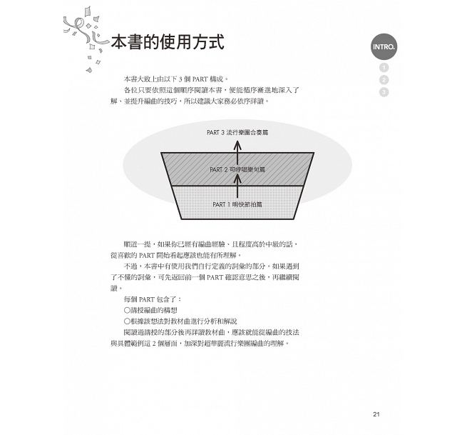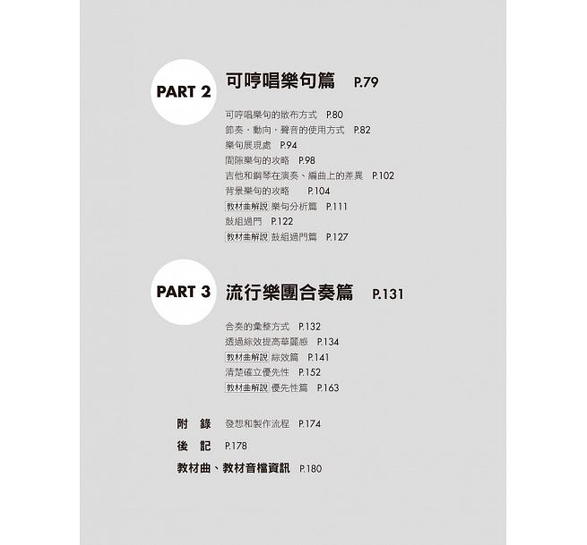 目錄 推薦序 前言INTRO. 超華麗流行樂團編曲的基本知識 製作超華麗流行樂團編曲時需特別留意的2件事 編曲的加-減-乘-除 鼓組對照表與鋼琴捲軸(piano roll) 本書的使用方式 關於教材曲PART 1 明快節拍篇 如何敲擊出明快的節拍 明快的鼓組編排 教材曲解說 鼓組篇 明快的貝斯編曲 教材曲解說 貝斯篇 明快的吉他編曲 明快的鋼琴編曲 教材曲解說 鋼琴篇PART 2 可哼唱樂句篇 可哼唱樂句的散布方式 節奏-動向-聲音的使用方式 樂句展現處 間隙樂句的攻略 吉他和鋼琴在演奏、編曲上的差異 背景樂句的攻略 教材曲解說 樂句分析篇 鼓組過門 教材曲解說 鼓組過門篇PART 3 流行樂團合奏篇 合奏的彙整方式 透過綜效提高華麗感 教材曲解說 綜效篇 清楚確立優先性