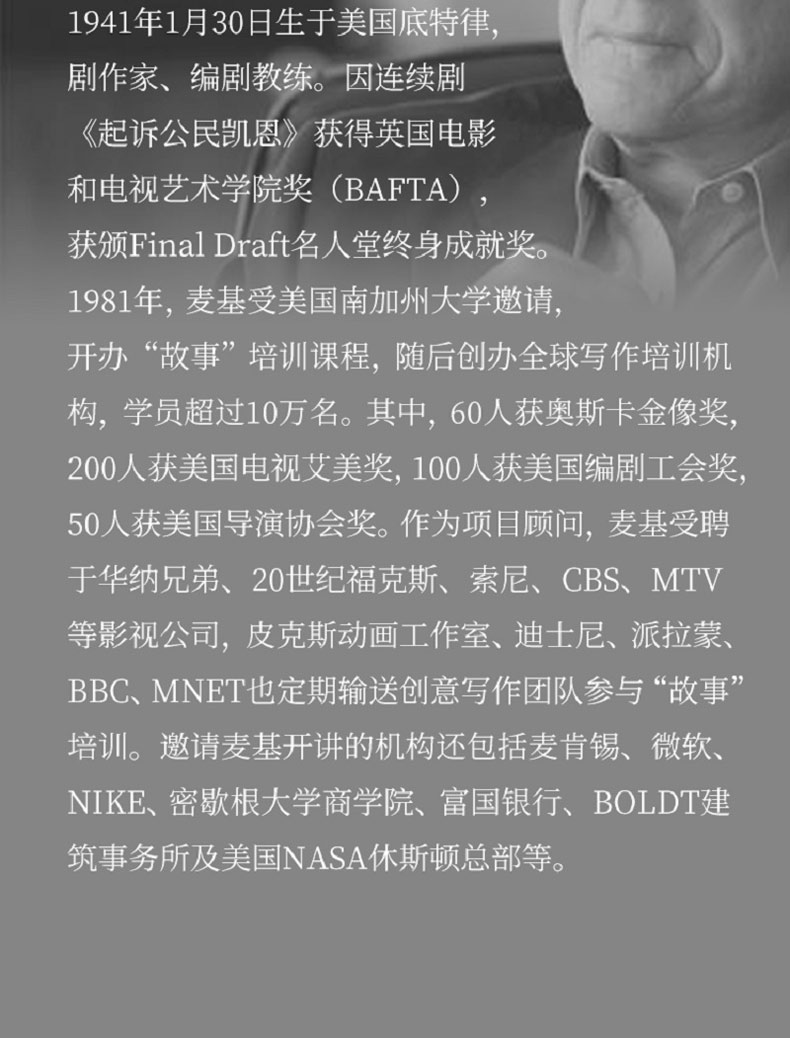 羅伯特 麥基,1941年1月30日生於美國底特律,劇作家、編劇教練。因連續劇《起訴公民凱恩》獲得英國電影和電視藝術學院獎(BAFTA),1981年,麥基受美國南加州大學邀請,開辦“故事”培訓課程,隨後創辦優選寫作培訓機構,學員超過10萬名。其中,60人獲奧斯卡金像獎,200人獲美國電視艾美獎,100人獲美國編劇工會獎,50人獲美國導演協會獎。