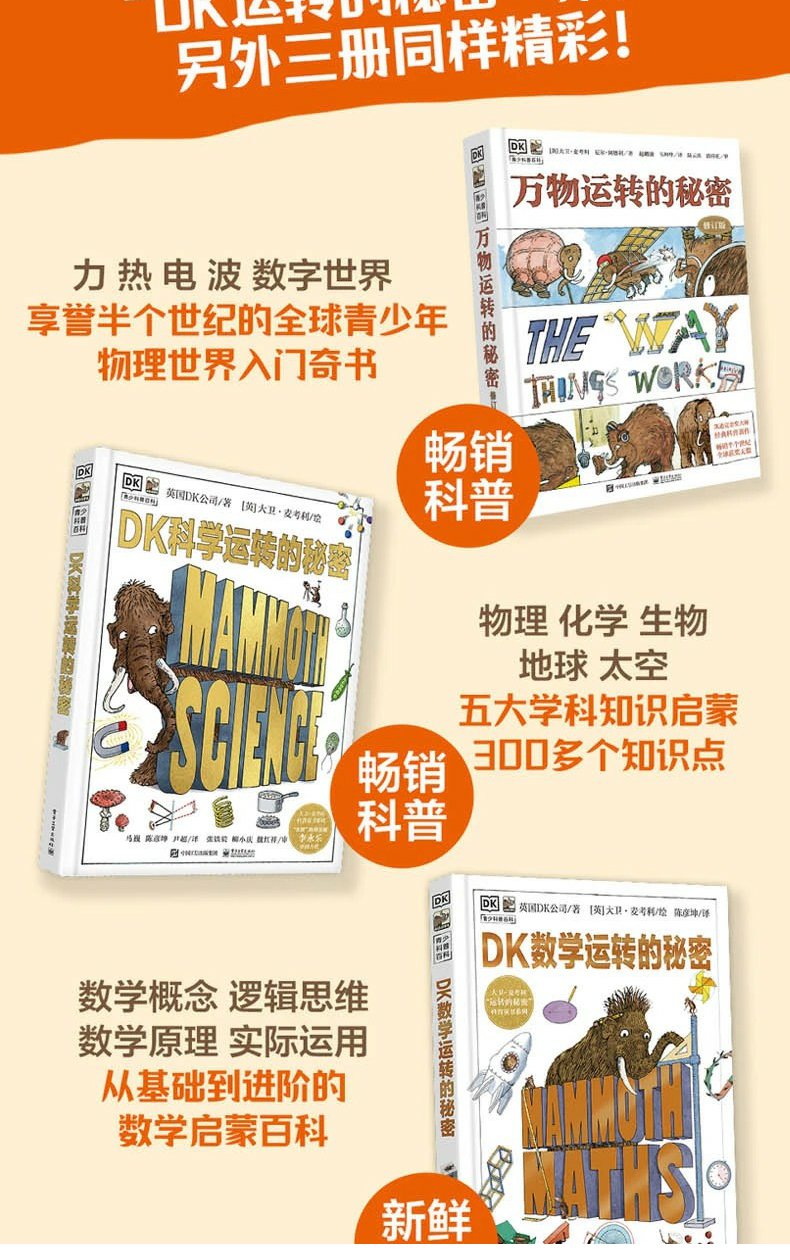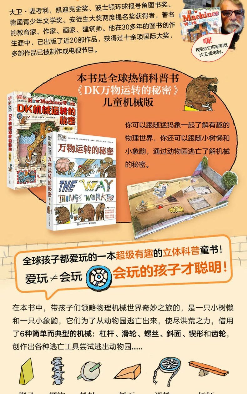 《DK萬物運轉的秘密 修訂版》是凱迪克金獎得主大衛·麥考利經典科普百科書的最新修訂版本,這本充滿創意的物理世界入門書自出版以來暢銷半個世紀,讓看似毫不相關的事物有了絕妙的聯繫。書中可愛幽默的猛獁將帶領我們進入一個迷人的物理世界,它以詼諧的方式描繪了數百種機械運轉的原理,展現了物理源於生活的發展歷程,從簡單的起重機到高科技的網絡,盡數囊括其中,文字簡單易懂,語言風趣幽默,即使不具備任何科學常識的讀者,也能對複雜的物理世界恍然大悟,是激發青少年物理熱情的必備典藏。