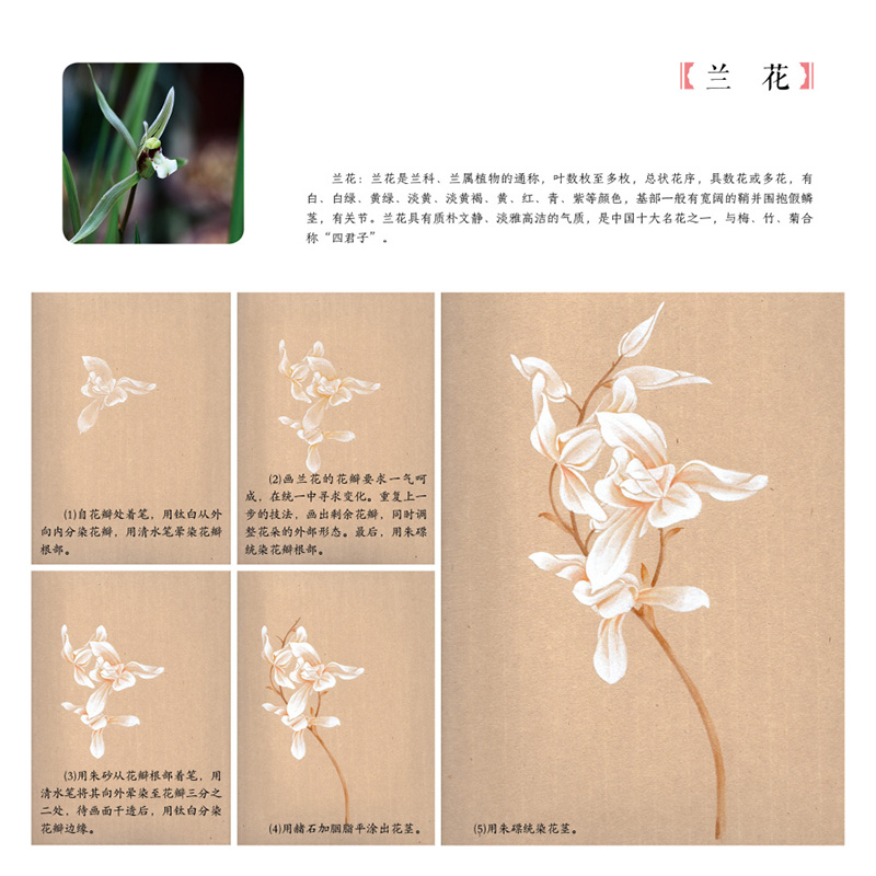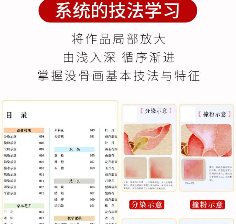 《中國畫傳統技法教程·沒骨花卉日課》是針對國畫初學者所策劃的一本沒骨花鳥畫技法書。 全書框架分概述、沒骨技法解析、草本花卉、木本花卉、禽鳥、草蟲及教學課稿七個部分。 其中沒骨技法解析、草本花卉、木本花卉、禽鳥、草蟲屬於技法講解部分,技法講解部分精選50餘種花卉,10種禽鳥及10種草蟲,並對每一種內容進行詳細的講解 。 每種內容的講解分花鳥介紹、相關畫稿、相關作品、分步驟講解及歷代沒骨花鳥名品賞析五部分。 教學課稿部分為技法講解部分相對應的畫稿及作品的原大排列,更方便讀者檢索、臨摹、學習。