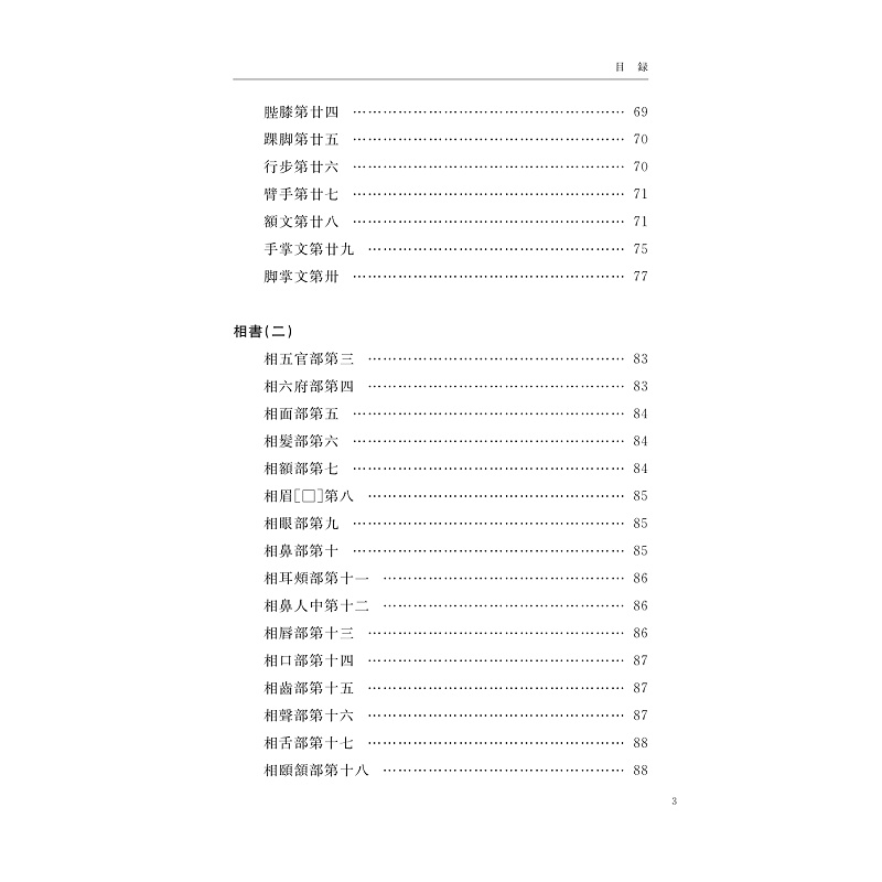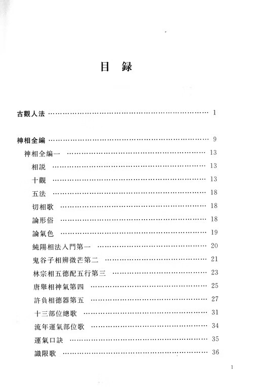 本書收錄《古觀人法》《神相全編》《相法十六篇》《鑑辨小言》《神相鐵關刀》《白鶴仙數相法》等作品。其中《神相全編》卷帙宏富,廣採諸家,內容詳備,堪當中國古典相人術集大成之作品。此書明清時流傳較廣,《麻衣相法》《統會諸家相法》等皆據其剪裁而成。 《古觀人法》與《鑑辨小言》短小精悍、眉目清朗,為文人相法之代表作品。其中《鑑辨小言》又名《冰鑑》,在近現代頗具影響力。 《相法十六篇》《神相鐵關刀》《白鶴仙數相法》三書文辭簡易,實操性強,為術士相法之代表作品。本書蒐集諸多版本,對所選作品進行了精心點校,供相法研究者和愛好者參考。