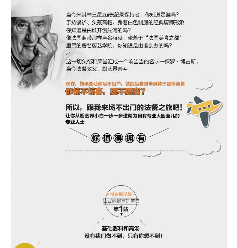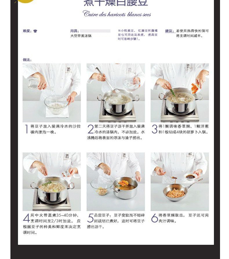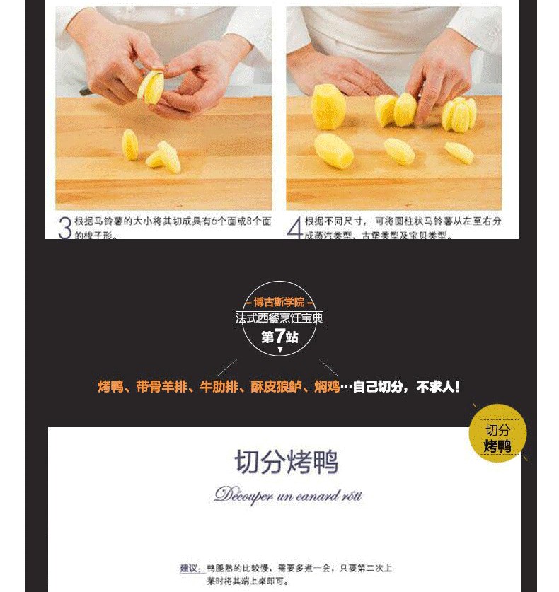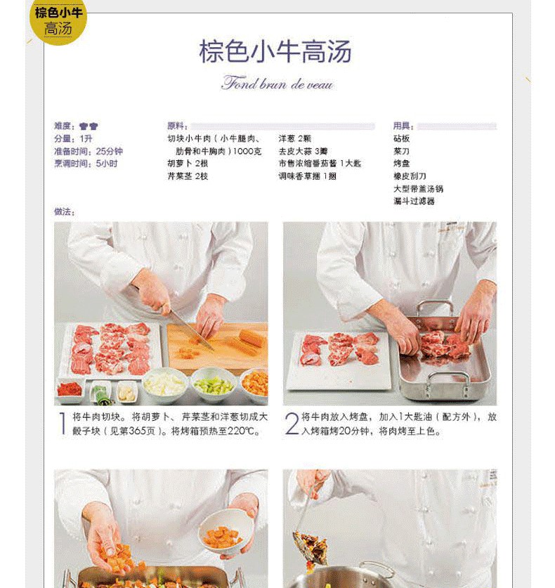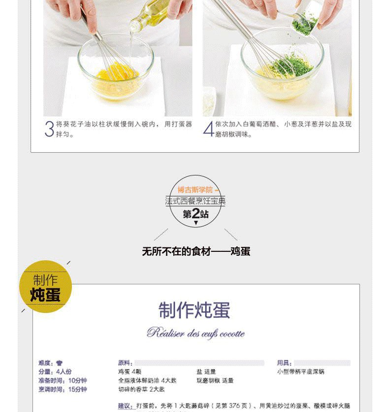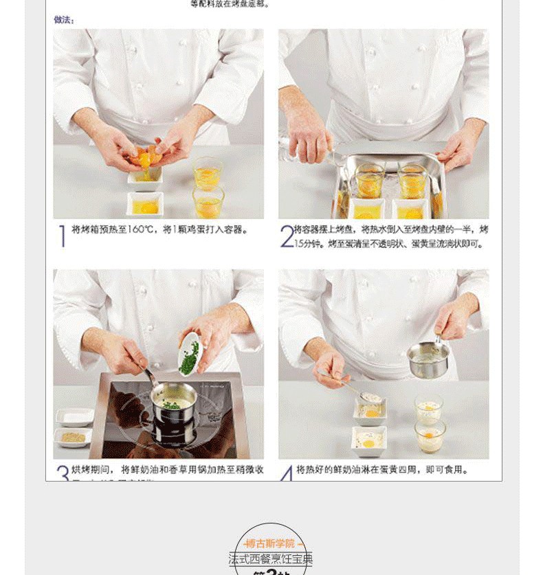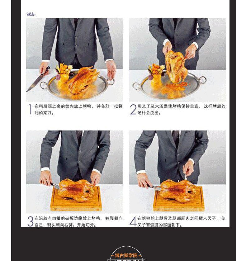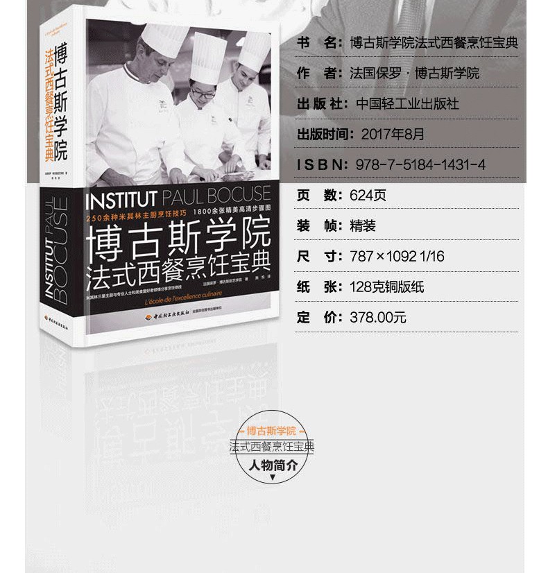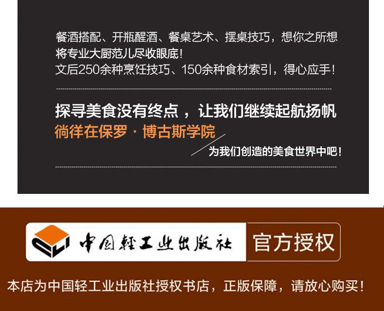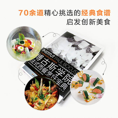 《博古斯學院法式西餐烹飪寶典》是被譽為培養“法國名廚和餐飲業管理者搖籃”的廚藝學院——法國保羅·博古斯廚藝學院的培訓課程教材。法餐教父、現代法國菜之父及米其林三星紀錄保持者保羅·博古斯親自教你做菜! 《博古斯學院法式西餐烹飪寶典》的內容主要包括雞蛋、*類、海鮮類、穀物及蔬菜等幾乎全部食材的處理方法及烹飪技巧。同時,講解了切分餐點及裝盤上菜的步驟等。 zui後,傾情獻上精心挑選的70餘道食譜的詳細的製作方法,還配有烹飪技巧及食材索引,供專業人士及美食愛好者學習和借鑒。