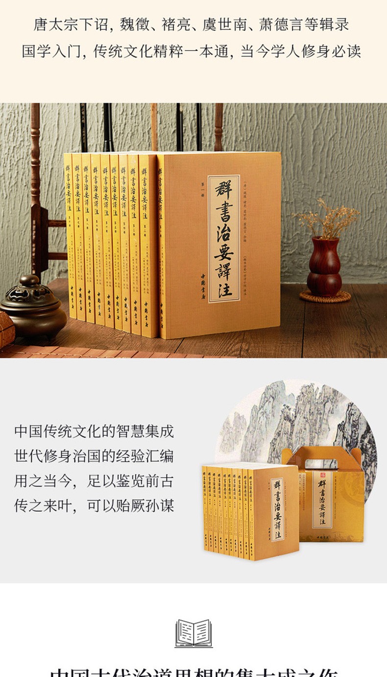 《群書治要譯註(套裝共10冊)》整理歷代帝王治國資政史料,擷取經、史、諸子百家中,有關修身、齊家、治國、平天下之精要,彙編成書。上始五帝,下迄晉代,自一萬四千多部、八萬九千多卷古籍中,博採典籍六十五種,共五十餘萬言。書成,如魏徵於序文中所說,實為一部”用之當今,足以鑑覽前古;傳之來葉,可以貽厥孫謀”的治世寶典。