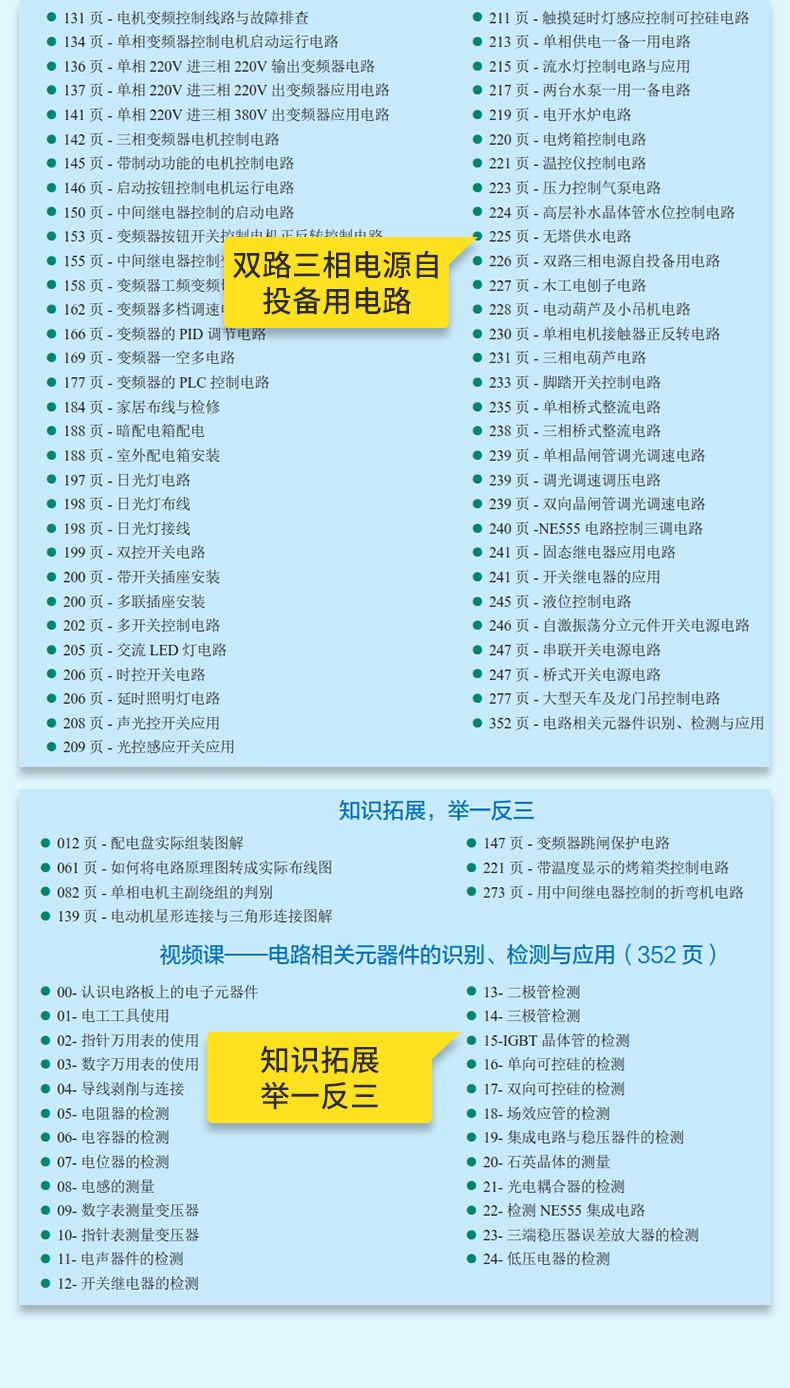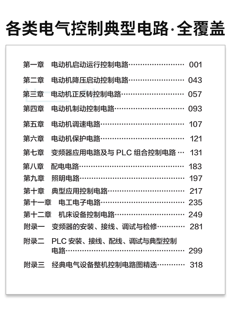 本書內容包括:電工基礎入門、電子元器件、常用電器元件、電工識圖、電工計算、電工工具和電工儀表、電動機、導線的加工和連接、電工安全與觸電急救、電工焊接技能、電工佈線與設備安裝技能、電工檢測技能、電動機的拆卸與檢修技能、供配電線路及檢修調試技能、照明控制線路及檢修調試技能、電動機控制線路及檢修調試技能、變頻器技術、變頻器的使用與調試、PLC技術和PLC編程語言與PLC系統的安裝及調試等。