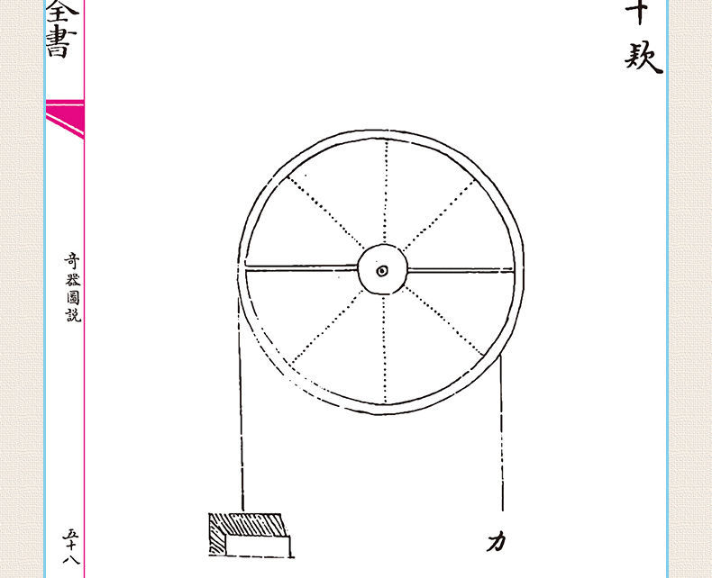 明西洋人鄧玉函、明王徵撰。徵,涇陽人。天啟壬戌進士,官揚州府推官。嘗詢西洋奇器之法於玉函,玉函因以其國所傳文字口授,徵譯為是書。其術能以小力運大,故名曰重學,又謂之力藝。大旨謂天地生物,有數,有度,有重。數為算法,度為測量,而重則即此力藝之學,皆相資而成,故先論重之本體,以明立法之所以然,凡六十一條。次論各色器具之法,凡九十二條。次器重十一圖,引重四圖,轉重二圖,取水九圖,轉磨十五圖,解木四圖,解石、轉碓、書架、水曰晷、代耕各一圖,水鏡四圖,圖皆有說,而於農器水法尤為詳備。 《諸器圖說》,凡圖十一,各為之說,而附以銘贊,乃徵所自作,亦具有思致雲。
