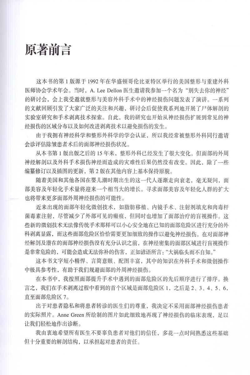 本書用言簡意賅的文字,配以清晰的局部解剖圖片、精美的藝術插圖及解剖學視頻,系統闡明了面部組織的解剖結構,組織填充物和肉毒毒素注射的安全操作,以及如何安全進行美容皮膚科無創操作、醫學美容儀器設備操作等,可指導臨床醫生規避面部運動中的主要危險區,限度地規範並提高神經系統手術操作的安全性,運動神經支損傷、失明和組織栓塞等併發症。