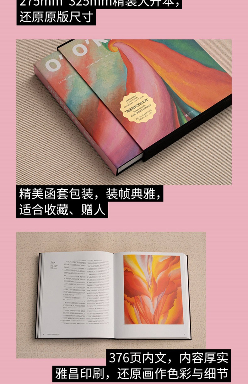 值得收藏的歐姬芙大畫冊。收錄歐姬芙300餘幅作品,275mm*325mm精裝大開本帶函套,藝術獲獎印廠雅昌印刷,還原畫作色彩與細節,讀者可以切身體會藝術家的創作理念和過程。