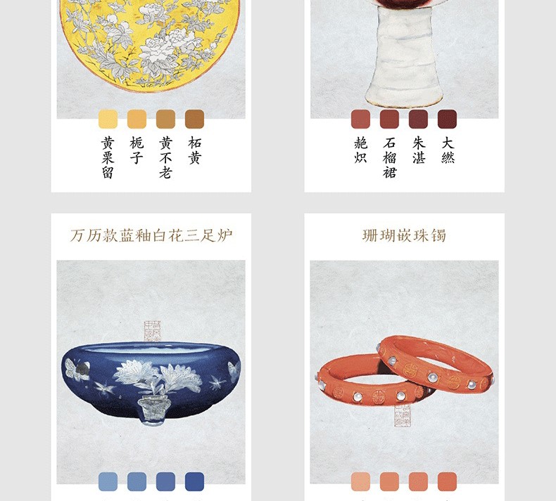 本書展現了的中國色彩文化傳承,讀之重獲中國傳統色之美。中國古代漢語中顏色詞的豐富代表了華夏文明的進化高度。豐富的顏色詞由詩詞、典籍、史書、字書、藥典、佛經等傳承至今,但散漫難尋,《中國傳統色》梳理、歸納384種中國傳統色色名,有據可查,有典可尋。又從十幾萬件故宮館藏文物中,根據24節氣72物候精選96件應時應節應色的文物,以手繪方式複原、呈現文物被磨損的色彩,提取中國傳統色色譜。