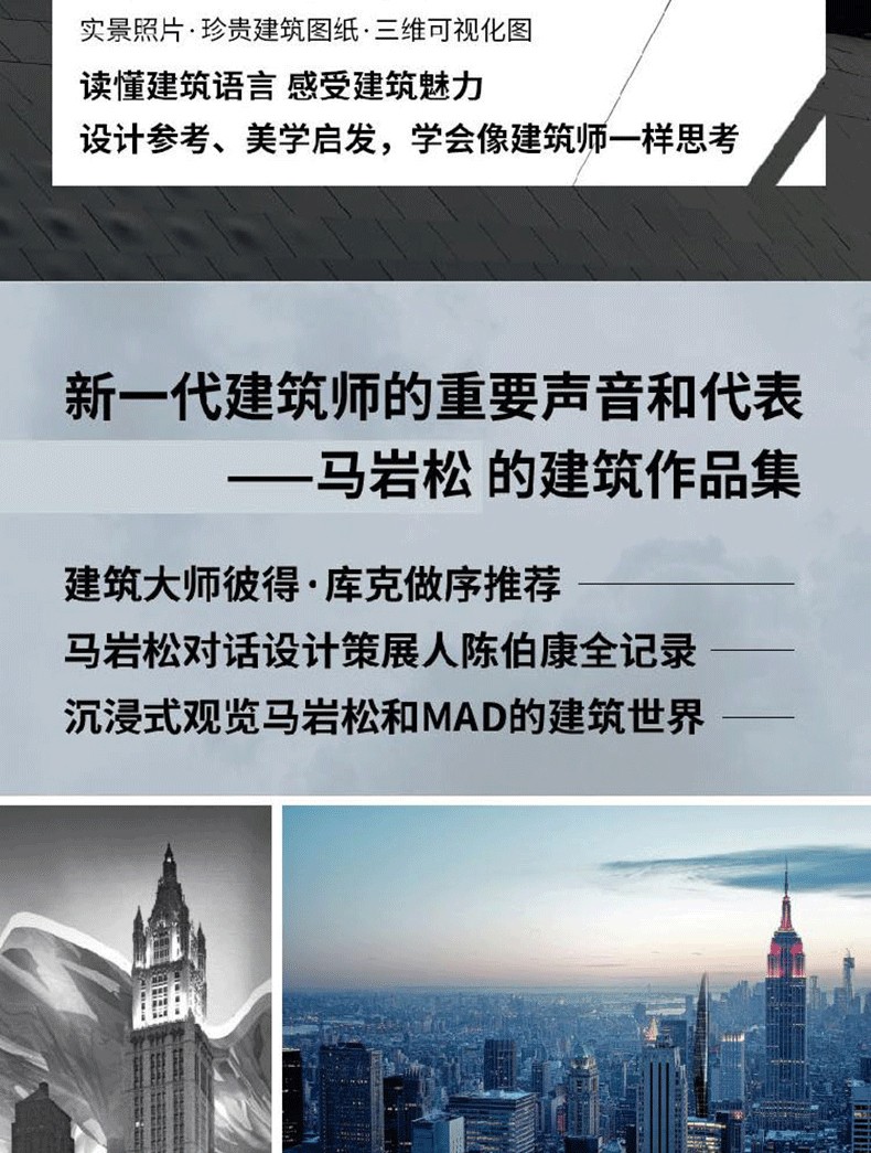 書中除了聲名赫赫的夢露大廈、哈爾濱大劇院,還囊括山丘庭院、UNIC等MAD新近建築作品,透過分析藝術作品、研究探討和展陳項目,帶領我們了解馬岩松「山水」概念的起源,對建築「自然觀」、人與空間的態度。在與陳伯康的對談中,對現代主義建築家密斯·凡·德·羅、路易斯·康的建築理念進行更具中國特色的解讀,為我們理解現代主義建築提供全新思路。
