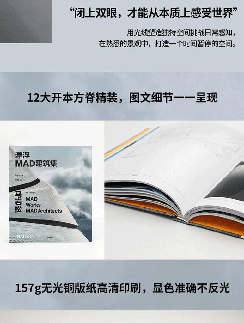 在《漂浮:MAD建築集》中,馬岩松解析了自己近14年的代表建築作品。馬岩鬆的建築可以說是將「自然現代化」。透過28件建築作品,200多幅清晰實景照片、珍貴建築圖、立體視覺化圖,深入了解馬岩鬆的建築與自然、空間的關係,沉浸式觀賞馬岩鬆的建築世界。