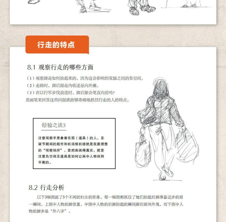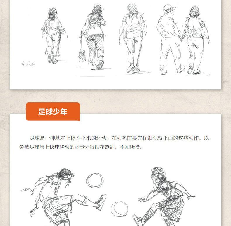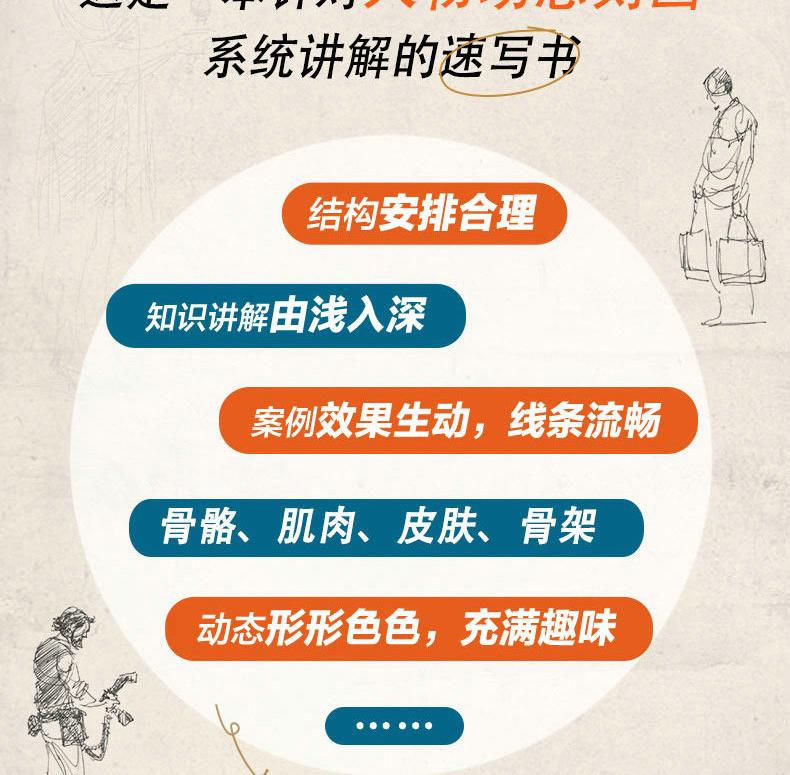 全書共17章。首先講解速寫的基礎知識和人物的動作分析;然後從不同的角度詳細地講解日常活動中的人物特徵、坐姿的畫法、玩桌上游戲的人的畫法、站姿的畫法、行走人物的畫法,以及兒童的畫法;最後按照不同專題展示特殊場合的人物的畫法、載歌載舞的人物的畫法、動物園中的人物的畫法,