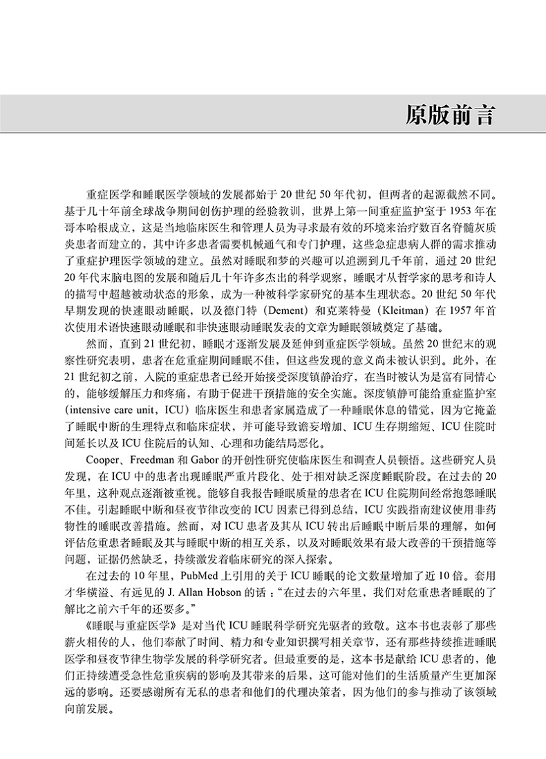 1953年,世界首個重症監護室創立於哥本哈根,由此開創了重症醫學領域的發展。 1920年代後期腦電圖的發展加速了睡眠醫學的發展。然而,直到本世紀初,睡眠發展才逐漸擴展到重症醫學領域。在過去的20年中,研究表明,睡眠障礙既是重症的合併症,也給ICU重症患者帶來不良影響,包括譫妄風險升高、對疼痛敏感性增加、術後恢復延遲、ICU住院時間延長、ICU後認知能力惡化、ICU生存率降低等。因此,如何改善ICU重症患者的睡眠障礙、改善病人預後引起ICU醫師的關注。 2018年8月,美國重症醫學會(SCCM) 次將ICU睡眠管理編入ICU 內成人病患疼痛、 躁動/鎮靜、譫妄、煞車以及睡眠中斷的管理指南(PADIS)。本書總結了當前有關危重病和康復期間睡眠相關知識,分章節討論了危重症患者睡眠特徵、非典型睡眠和病理性覺醒、正常睡眠與鎮靜期間意識改變的比較、睡眠中斷的生物學影響、ICU睡眠中斷的危險因素、常見ICU藥物對睡眠的影響、睡眠中斷及其與譫妄策略、ICU結局的關係、機械通氣和常見ICU藥物對睡眠的影響、睡眠中斷及其與譫妄等策略、ICU人群的關係、機械通氣和常見ICU藥物監測、睡眠中斷及其與譫妄等策略改善本書由睡眠醫學及重症領域的專家撰寫,包括重症監護醫師、睡眠專業醫師、護理師、醫師助理、藥劑師及呼吸治療師等。是幫助各級醫學專業技術人員對ICU重症病患睡眠生理學、睡眠評估管理、及ICU護理指導的綜合指南。