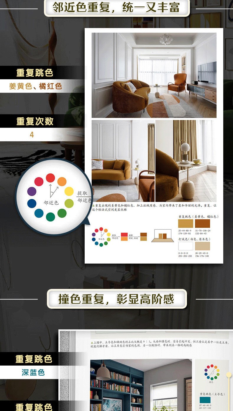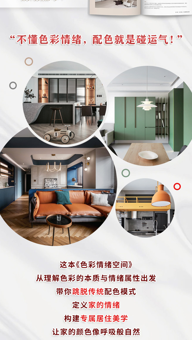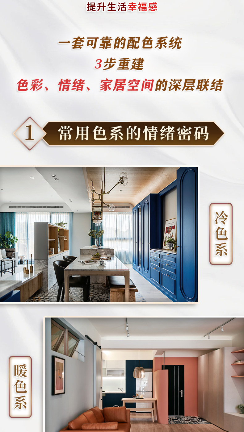 《色彩情緒空間》從色彩的基礎認知出發,系統梳理了冷色系、暖色系、中性色等家居常用色彩,並超越漆色本身,將視野拓展至材料、家具、家飾與綠植等多元載體,讓您理解色彩在家居中的綜合運用。