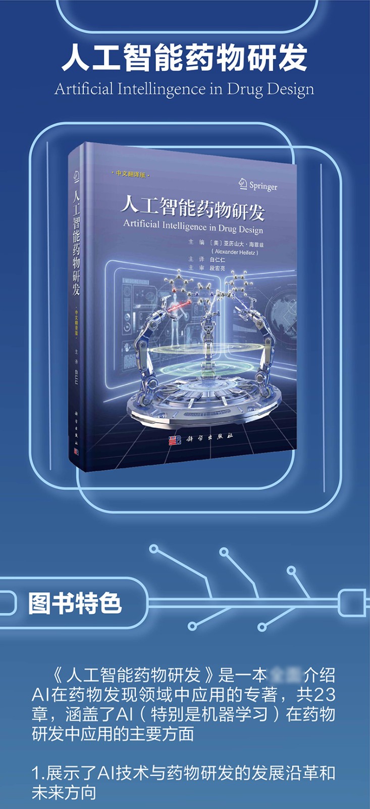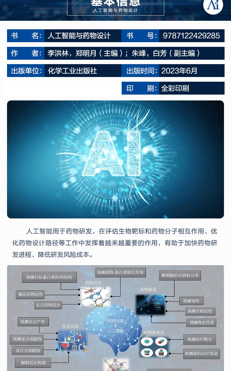 本書概述了藥物設計中人工智慧方法開發與應用的近期新進展,內容涵蓋藥物發現與開發、計算化學、藥物化學、藥物設計、藥理學等多個交叉領域。本書系統介紹了人工智慧對傳統藥物設計方法的加速和革新,包括基於結構和配體的藥物設計、增強和多目標從頭藥物設計、從頭分子生成、靶點結合活性與結合預測、ADMET(吸收、分佈、代謝、排泄和毒性)性質、藥代動力學、藥物代謝、藥物毒性預測、精準醫療、化學合成路線、大藥物分析,對未來人工智慧的影響。本書知識體系新穎、章節架構獨特,內容廣泛且翔實,案例豐富、圖文並茂,可供醫藥研發領域從業者、投資者、高等醫藥院校師生及對新藥研發有興趣者閱讀。